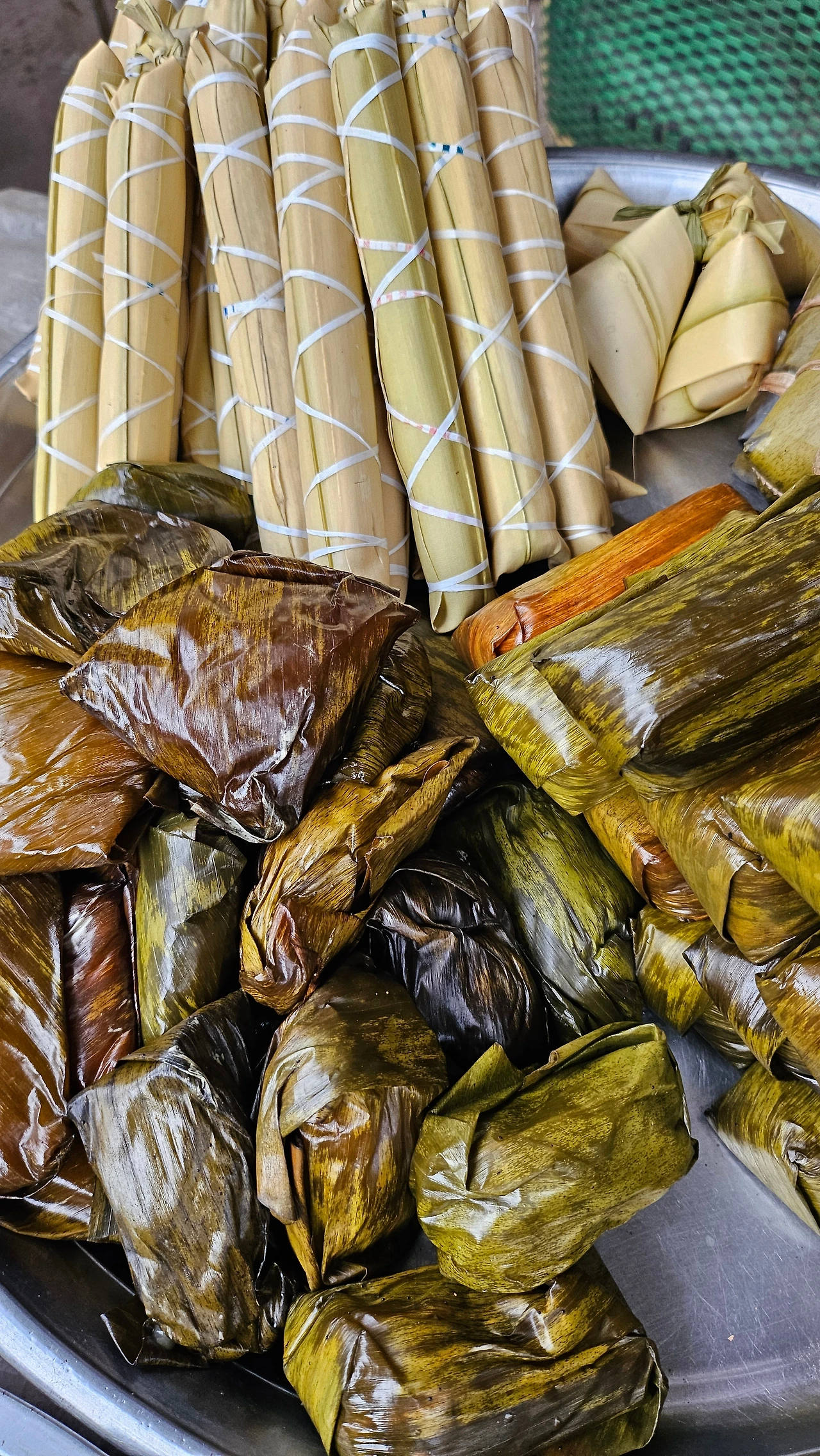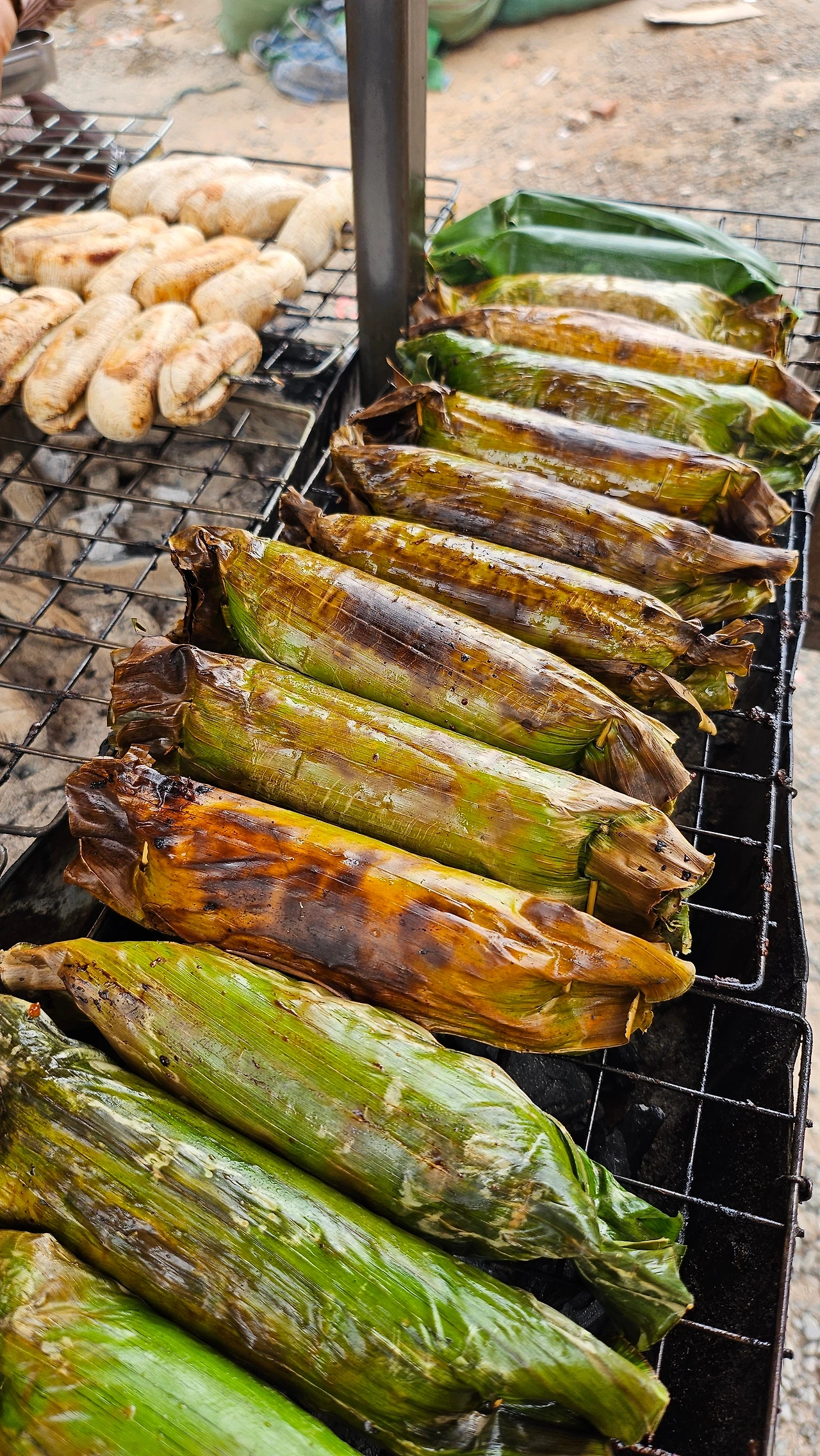 바나나 구이 아주머니는 돼지고기 꼬치구이 대각선 방향에 서 계신다. '땡큐'라고 망하면 캄보디아어로 '아콘'이라고 여러 번 말하며 캄보디아어를 알려주려고 한다. 나도 '아콘, 아콘'으로 대답한다. '맛있는 거 만들어 주셔서 감사합니다.'라고 마음으로 말한다. 바나나를 꼬치에 5개 꽂아 구운 건 2000리엘, 찹쌀밥에 싸서 구운 바나나 1개는 1000리이다. H와 나는 찹쌀밥이 둘러싸여 구워진 바나나를 더 좋아한다. 코코넛밀크를 넣어 만든 찹쌀밥은 코코넛의 고소함이 가득하다. 한 잎 베어 물면 바나나의 달콤함과 코코넛 향이 어우러져 디저트로 제격이다.