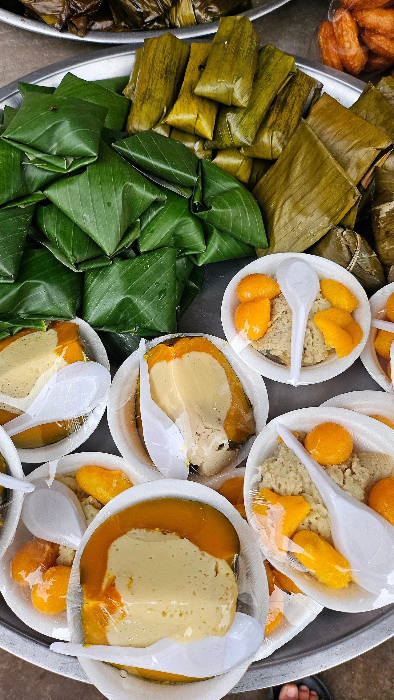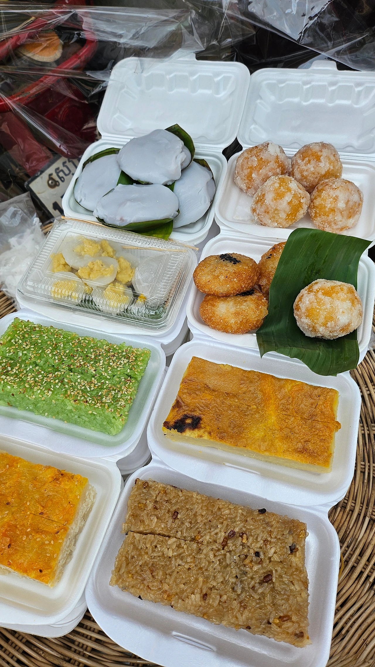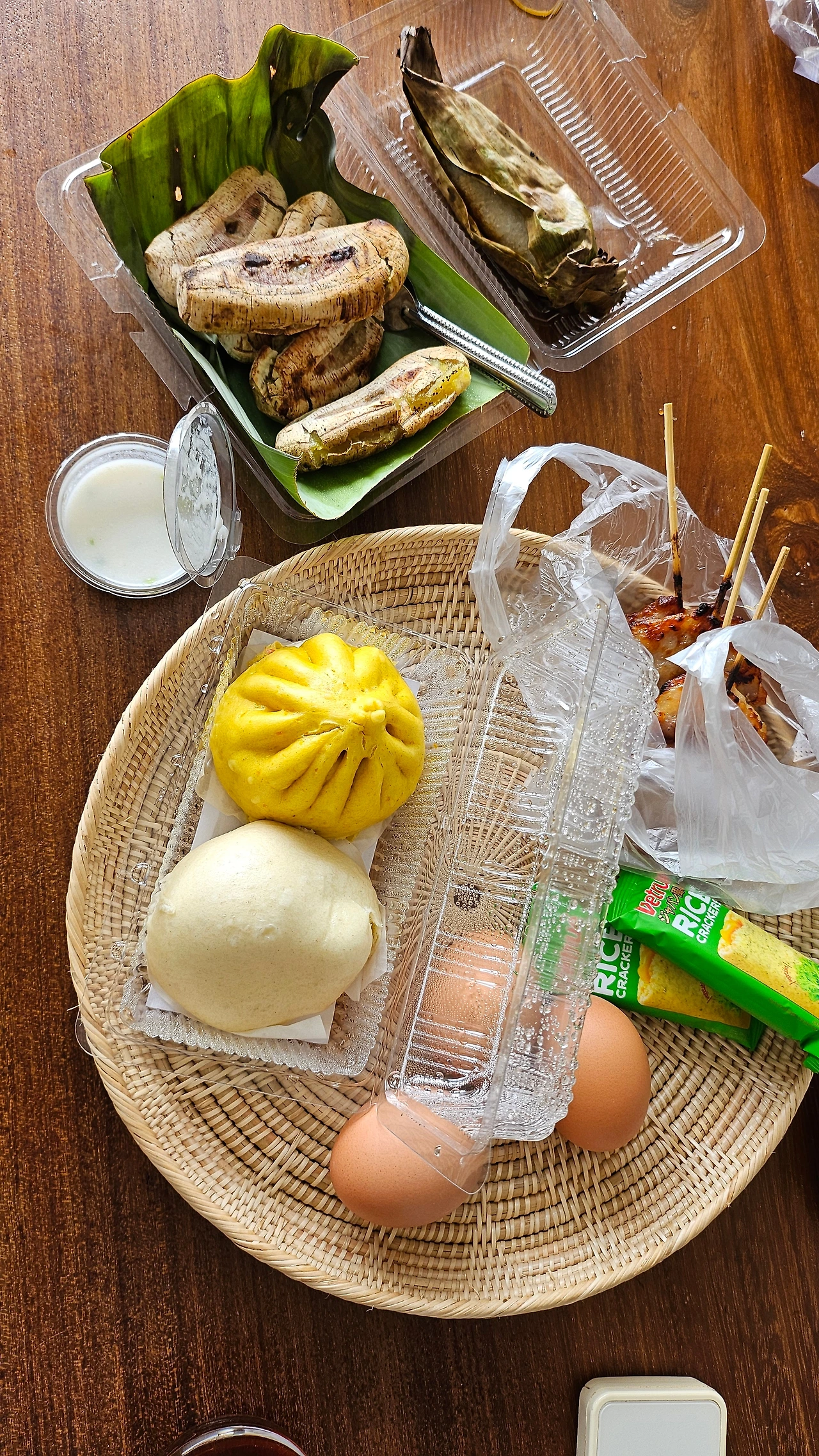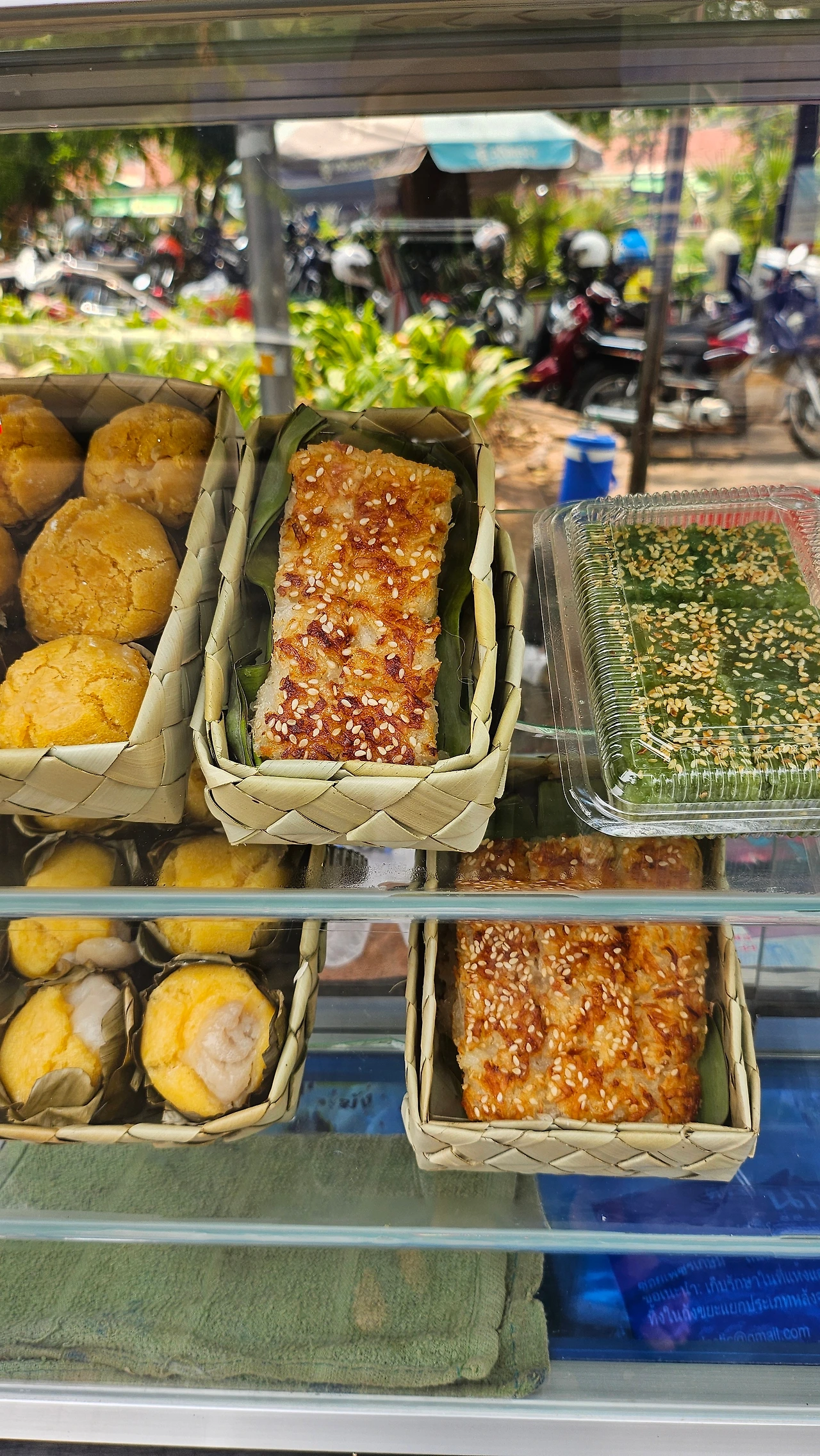 그래 오늘 점심은 이걸로 정했다. 삶은 달걀, 돼지고기 꼬치구이, 찹쌀밥을 감싼 바나나 구이, 망고, 코코넛 빵, 타로 빵, 참깨가 가득 뿌려진 캄보디아 디저트, 계란찜이 채워진 단호박찜, 땅콩 조금 등등