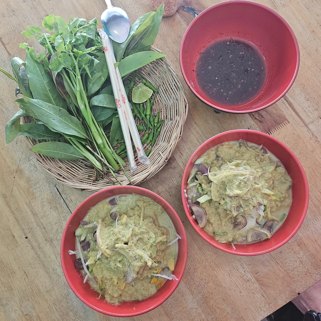 "이것도 캄보디아 사람들 아침, 점심으로 먹는 거잖아. 커리 국수. 왜 베트남은 맑은 국물의 쌀국수가 많잖아? 태국은 아주 걸쭉한 커리가 많고. 캄보디아는 그 위치상 그 중간에 있어서 그런지 음식도 그 중간 어디쯤인 것 같아."