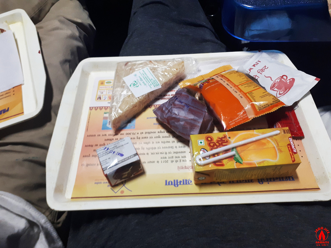보통 인도식 베지 샌드위치와 음료, 간식, 티가 나온다.(여름에는 아이스크림도 나온다.)