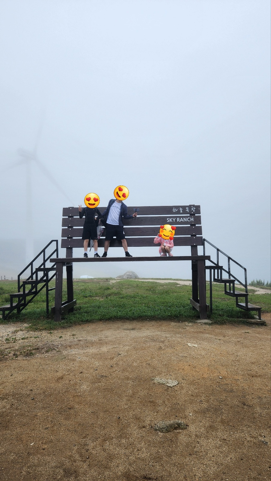 우여곡절 끝에 도착한 양떼 목장에 비바람이 몰아쳤다. 서둘러 얇은 긴팔을 꺼내 입었으나 역부족이었다. 8월 둘째 주에 추위라니 제대로 피서 온 것이 맞다고 우리끼리 위로하며 동면하는 다람쥐들처럼 꼭 껴안았다. 잠시 후, 트랙터마차라 불리는 대형 트랙터에 올라타 목장 정상으로 출발했다. 긴 시간 차를 타고 온 아이들에게 곧 절경이 펼쳐질 것이라며 큰소리치고 데리고 올라간 곳에서 당황하지 않을 수가 없었으니... 마치 산신령이 나타나 금도끼 줄까 은도끼 줄까 할법한 뿌연 우윳빛 절경만이 우리를 기다리고 있었다.