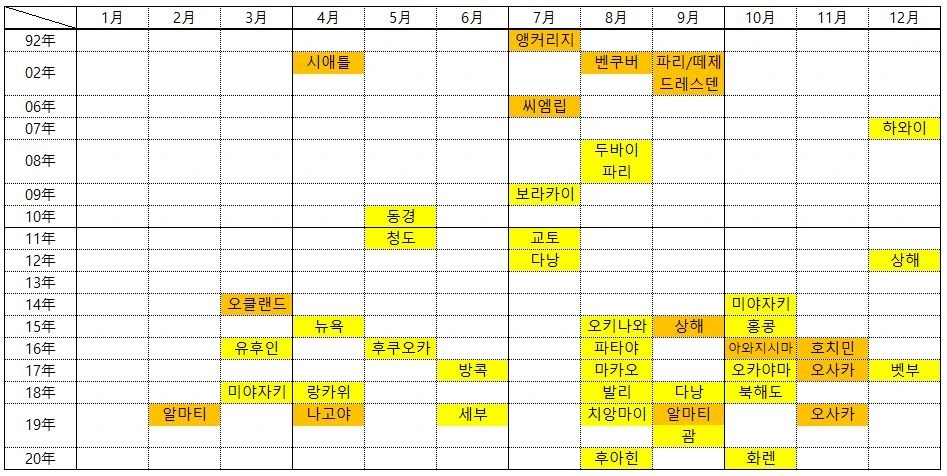 주황색은 그의 가족, 친구와 함께 가거나, 출장으로 간 여행지이다.