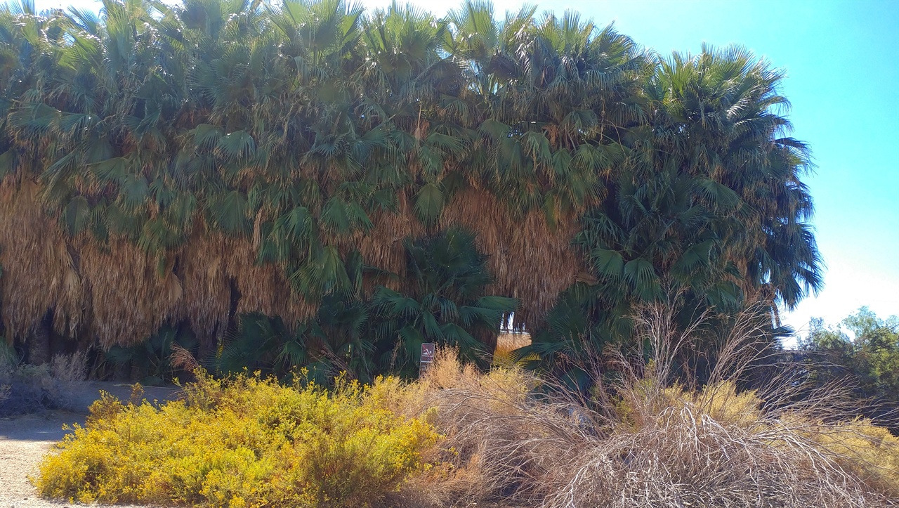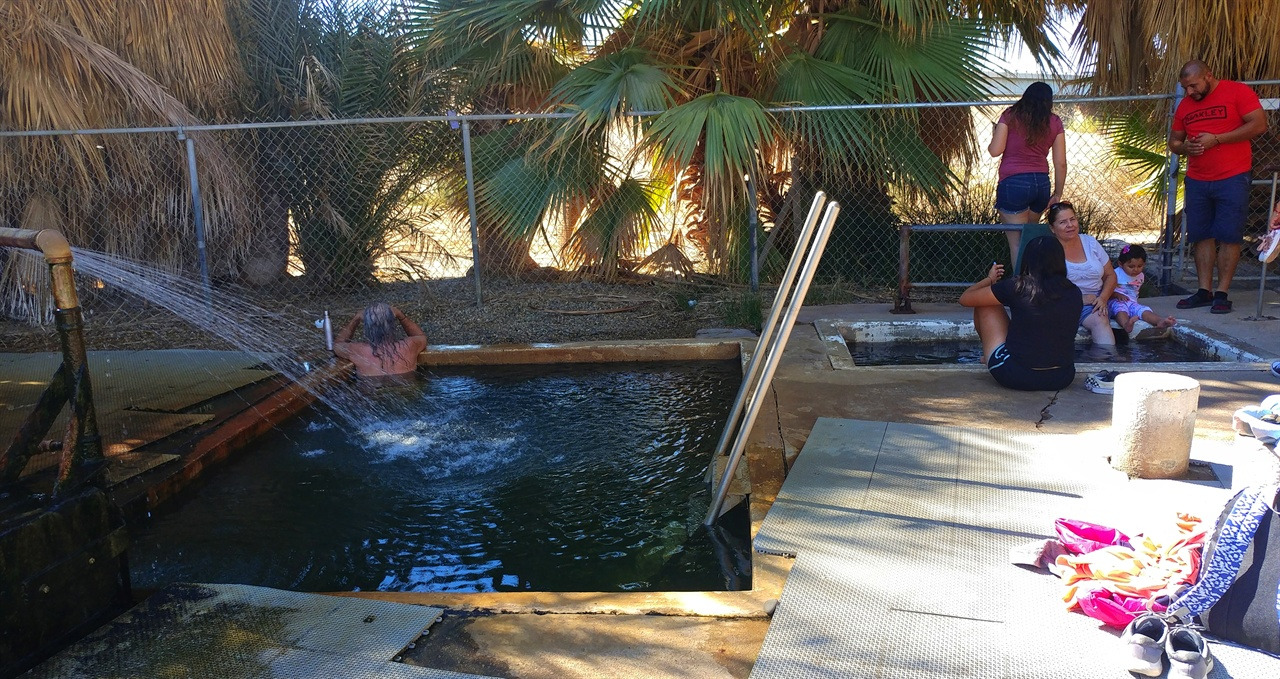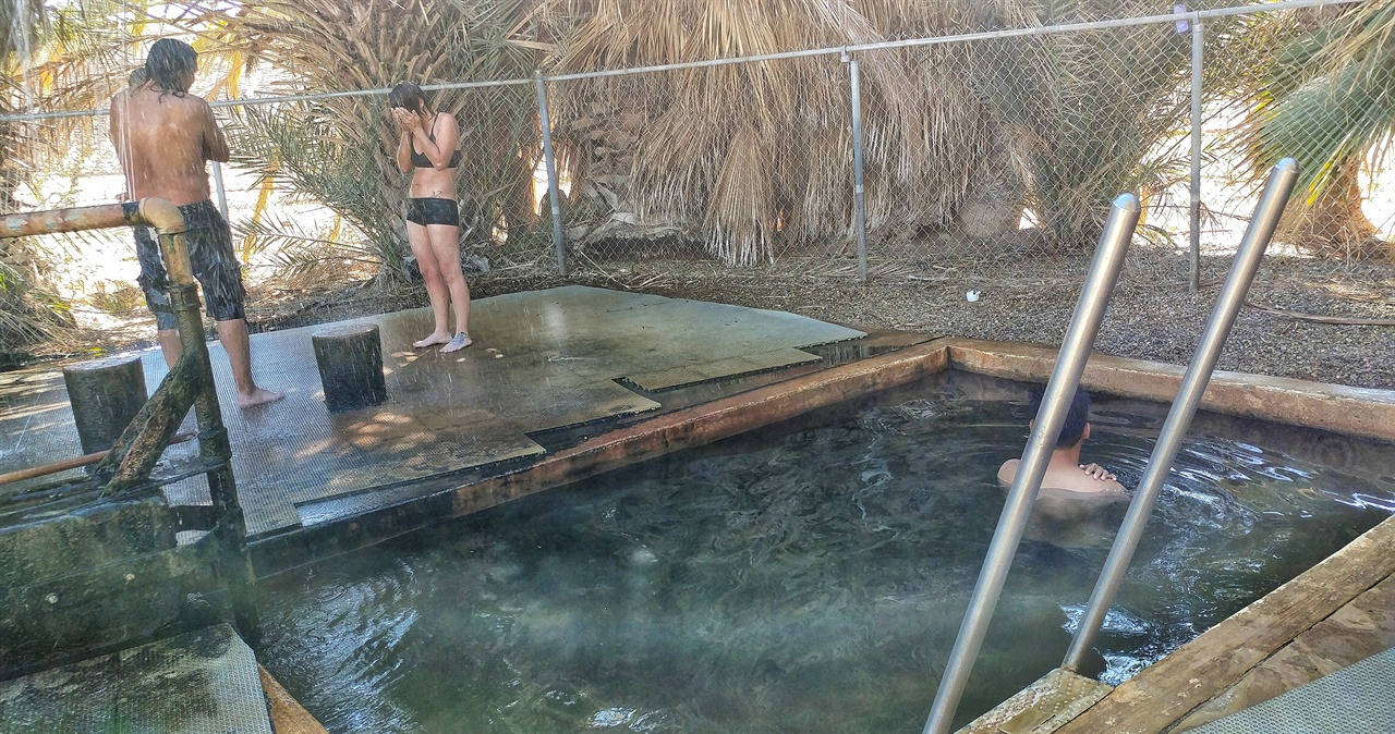 목적지에 도착하자 도로변에 간이 화장실이 있고 연못을 품고 있는 야자수 군락이 나타났다. 조금 높은 지대로는 8번 하이웨이를 따라 차들이 쌩쌩 달리고 있었다. 차도 옆에 온천이 있을 리 없겠지 하며 차로 돌아가려는데 야자수 뒤쪽으로 사람들이 걸어 나왔다. 철제 울타리가 둘러쳐진 홀트빌 온천(Holtville Hot Springs)이 야자수 뒤에 숨어 있었다.