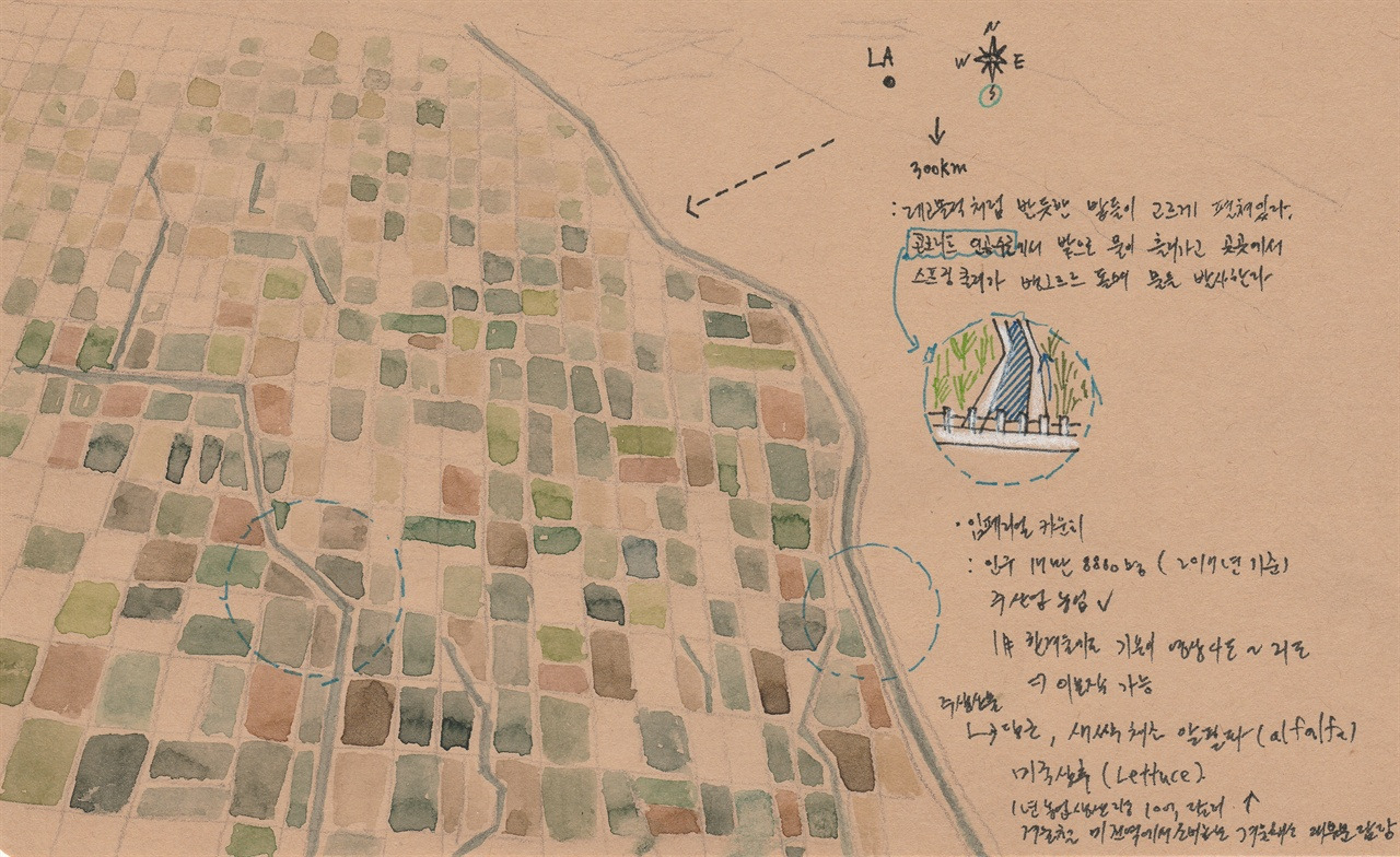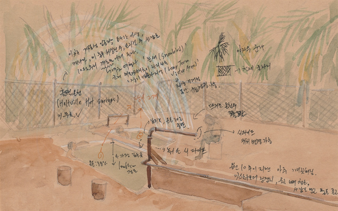 이번 목적지는 멕시코 국경지대에 있는 홀트빌 온천(Holtville Hotsprings)이다. 국경선과 직선으로 9km 떨어진 곳이다. 로스앤젤레스에서 남쪽으로 300km쯤 내려오자 길 양 옆으로 레고블럭처럼 반듯한 밭들이 고르게 펼쳐져 있다. 콘크리트 인공 수로에서 밭으로 물이 흘러가고 곳곳에서 스프링쿨러가 뱅그르르 돌며 물을 발사한다. 밤마다 경찰 헬리콥터가 용의자 차량을 향해 불빛을 쏘고 데시벨 높은 소방차 사이렌 소리가 밤을 찢어대는 로스앤젤레스에서 살다 모처럼 시골길을 달리자니 낯설기도 하고 그립기도 하다.