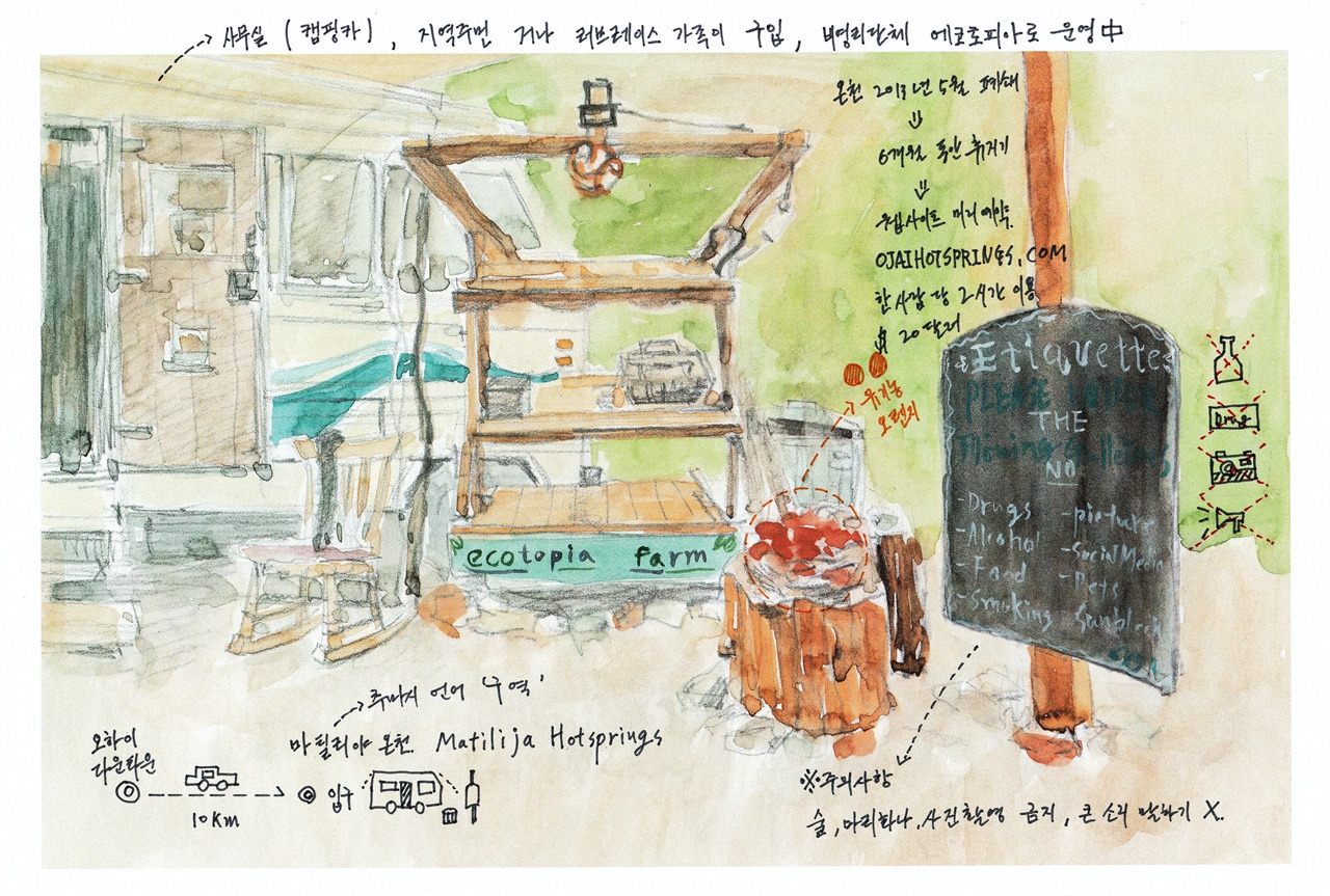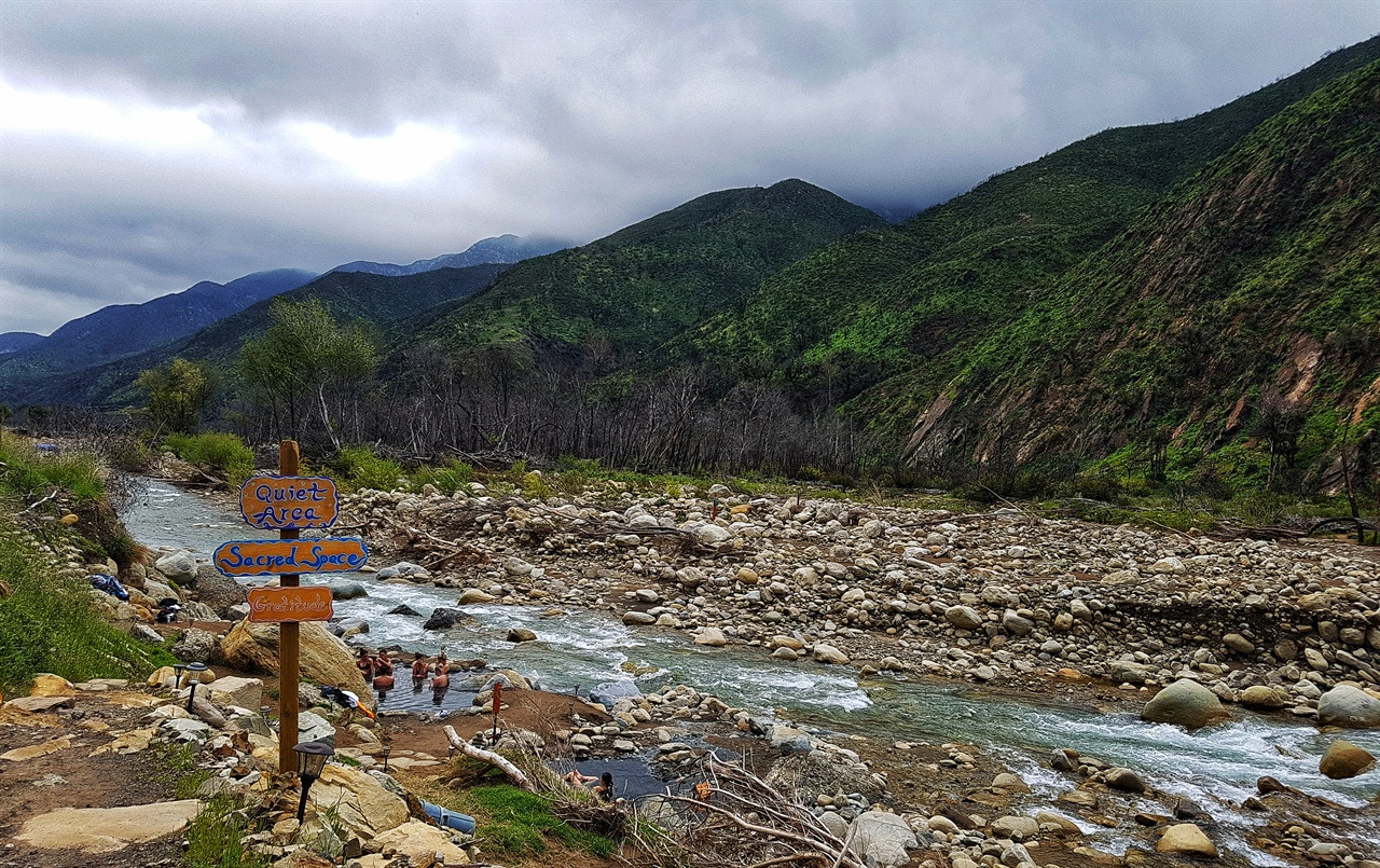 오하이 다운타운에서 10km를 이동해 목적지 마틸리야 온천(Matilija Hotsprings)으로 갔다. 굽은 산길 계곡에 면해 있어 지나치기 쉽다. 급한 마음에 불법 유턴을 하다가 큰 사고가 날 수 있다. 마틸리야는 추마시 언어로 '구역'을 뜻한다. 입구에 도착하니 사무실로 쓰는 캠핑카에서 여직원 마카가 나왔다. 마카는 바구니에 있던 유기농 귤 두 개를 건네주며 주의사항을 일러줬다. 술, 마리화나, 사진 촬영 금지. 큰 소리로 말하는 것도 주의해 달라고 했다. 보통 온천에서는 풀어져 노는 것이 일반적이지만 이곳은 정숙을 강조했다.