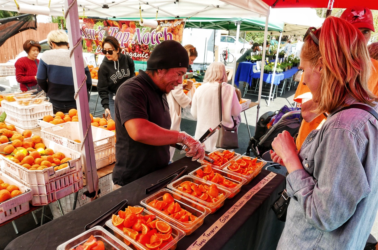 제주도 전통시장에서 회 한 접시 먹어야 하는 사람이라면 오하이에서는 농산물 직거래 장터인 파머스 마켓을 꼭 가야 한다. 매주 일요일 오하이 다운타운 디 아케이드 플라자 뒤편 공터에서 열린다. 시장은 왁자지껄한 민화 화폭이다. 곱게 염색한 두건을 쓴 여성 등 젊은 농부들이 직접 재배한 당근과 토마토, 브로콜리를 좌판에 올려 놓고 팔고, 한 켠에서는 악사가 기타와 바이올린을 꺼내 연주한다. 흙이 묻은 야채들은 마르지 않은 물감처럼 오하이 푸른 하늘에 반사된다. 갓 잡아올린 횟감처럼 자기 빛깔을 살벌하게 내비친다.