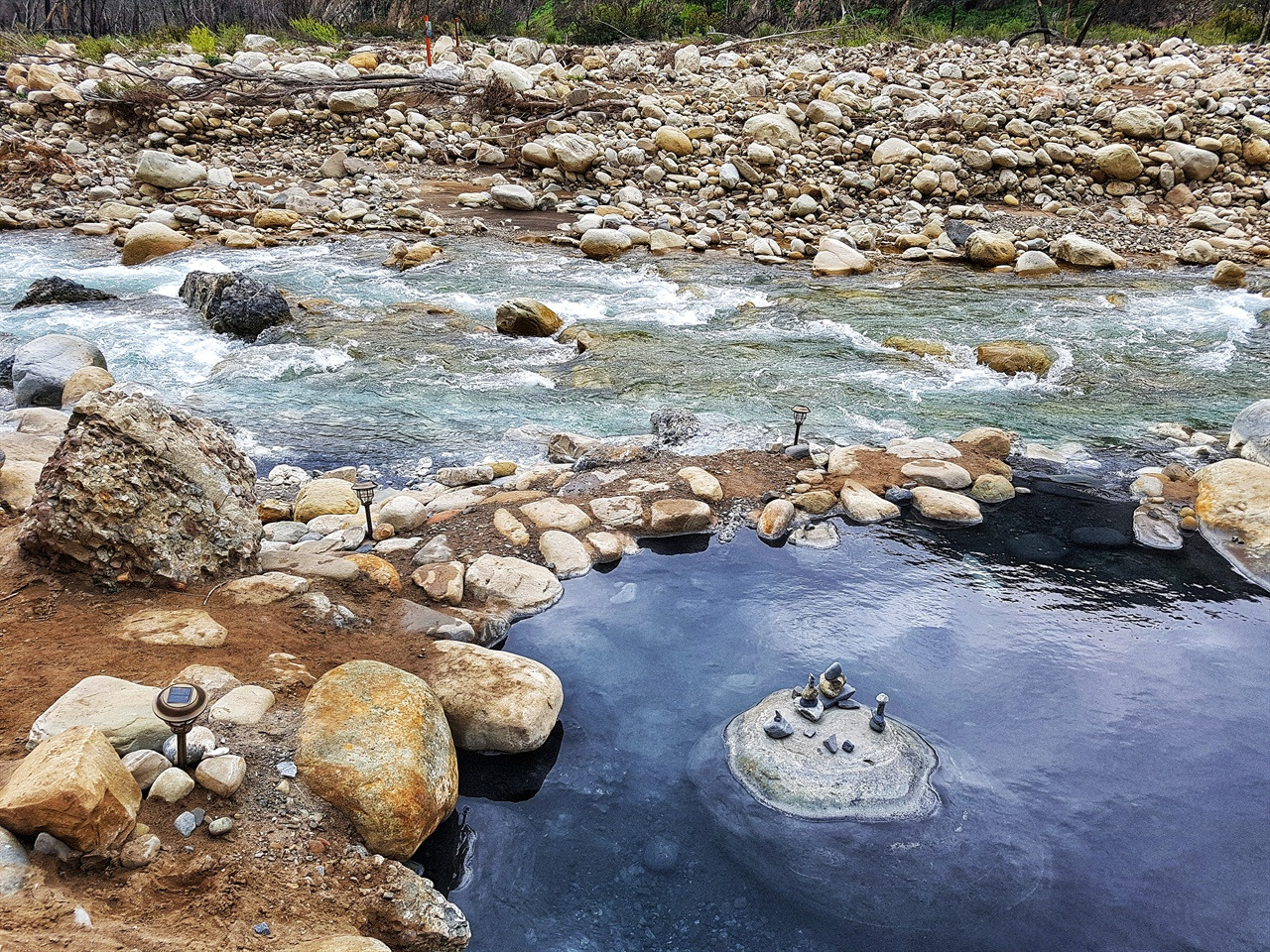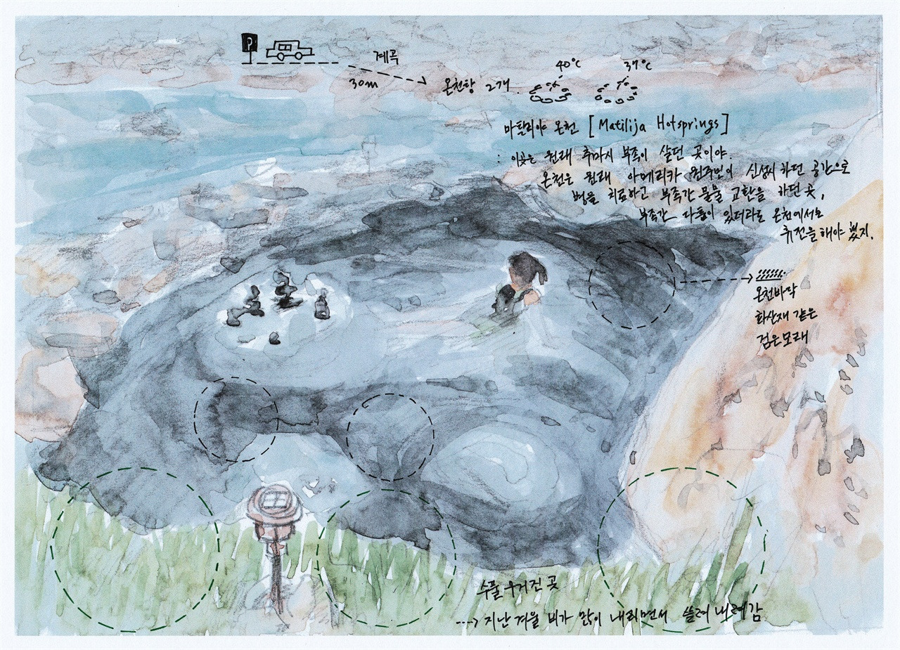 차를 세우고 30m쯤 계곡을 따라 걸어내려 가니 온천탕 2개가 나왔다. 물거품을 내며 빠르게 흘러 내려가는 계곡 옆에 있었는데, 하나는 수온 40도로 따뜻했고, 다른 하나는 37도 정도로 미지근했다. 주변에는 수풀이 우거져 있었는데 지난 겨울 비가 많이 내려 다 쓸려갔다. 온천 바닥에는 화산재 같은 검은 모래가 깔려 있었다. 흑과 백. 수묵화 같았다.