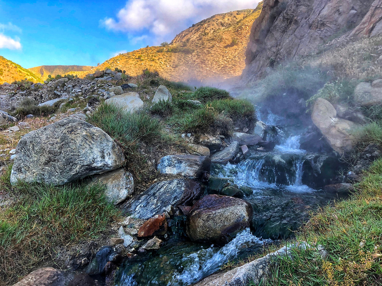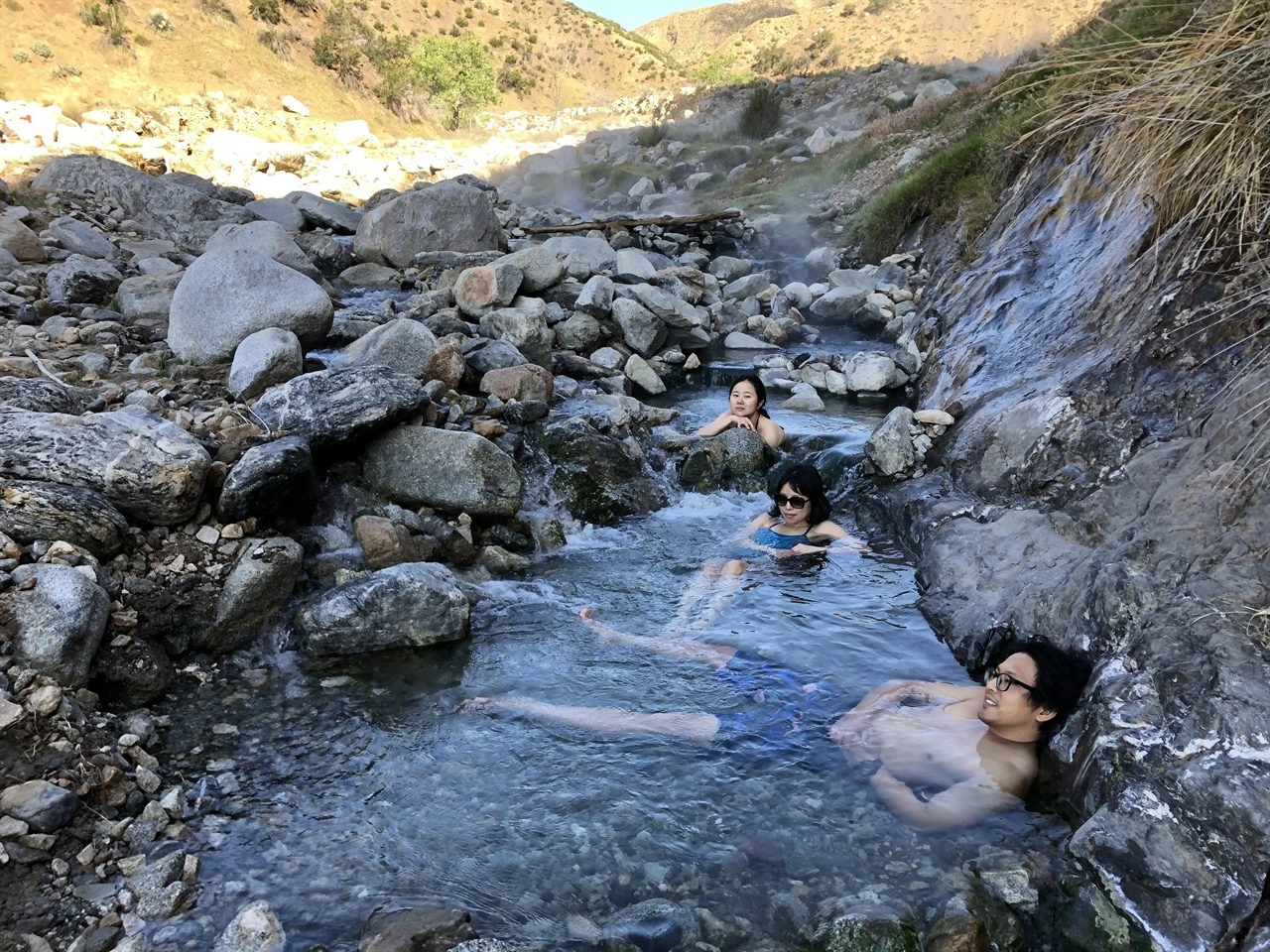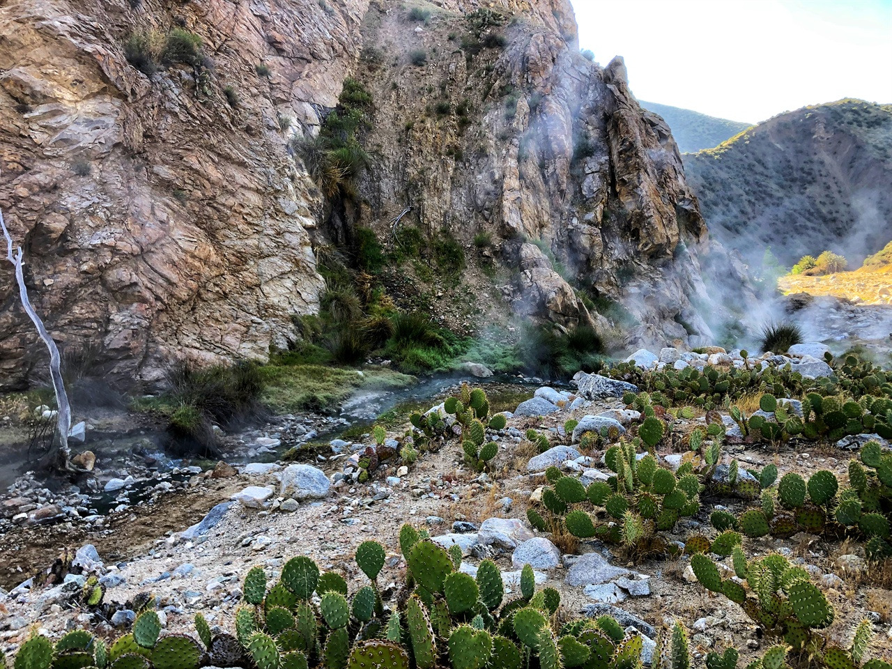 세스피 온천은 높은 암벽을 따라 수직낙하하고 있다. 수온이 80도 이상으로 남부 캘리포니아 자연 온천 중에서 가장 뜨겁다. 멋 모르고 손을 살짝 담갔다가 뜨거운 냄비 뚜껑을 만진 듯 귀를 잡았다. 온천 진원지에서 조금 내려가 차가운 물과 만나는 지점에 들어갔다. 돌로 뜨거운 물과 찬물을 적절히 막아가며 수온을 조절했다. 유리알처럼 맑고 투명한 물, 신들의 목욕탕에 몰래 들어왔나 겁이 났다.