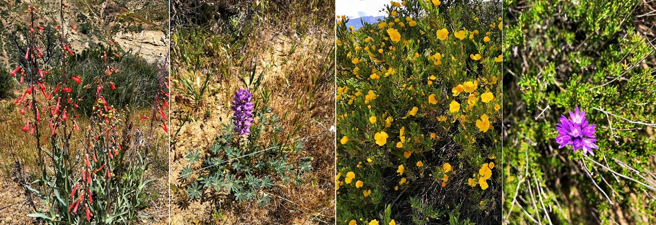 걷기는 어렵지 않다. 고도 936m에서 출발해 중간지점인 고도 764m까지 내려가다 다시 목적지 고도 947m까지 천천히 올라간다. 무더운 여름을 피해 봄, 가을에 산행하면 좋다. 우리가 간 날은 야생화가 흐드러지게 피어 있었다. 하늘거리는 한복 치마 같은 노오란 양귀비 꽃 '트리 파피(Tree poppie)', 주홍빛 호리병 모양의 꽃이 주렁주렁 달린 '스칼렛 버그러(Scarlet bugler)', 길다란 꽃대에 보라색 꽃이 촘촘히 달린 '루핀(Lupines)'이 제 빛깔을 뿜어내고 있었다. 척박한 사암지대에서 보는 꽃구경은 그야말로 꿀재미다. 큰 배낭을 매고 혼자 걷던 샌타바바라 출신 여성 하이커 세라가 나에게 다가왔다.