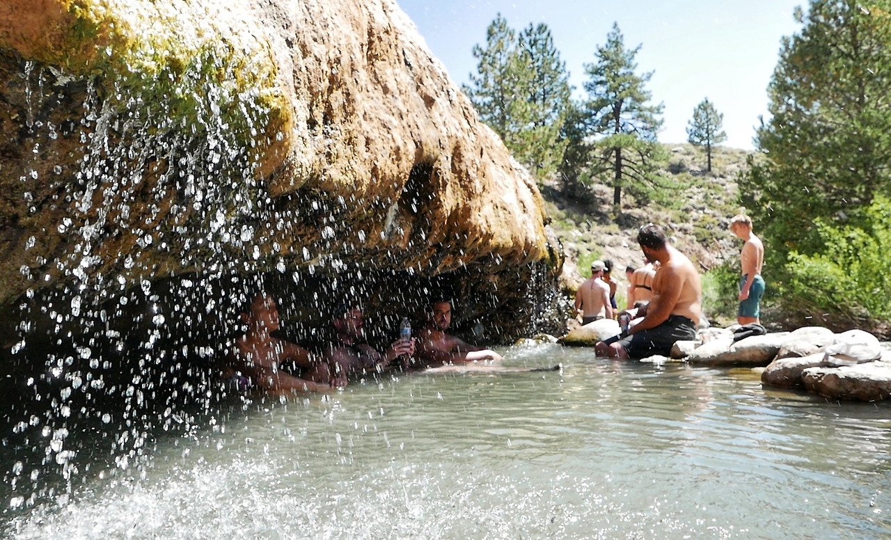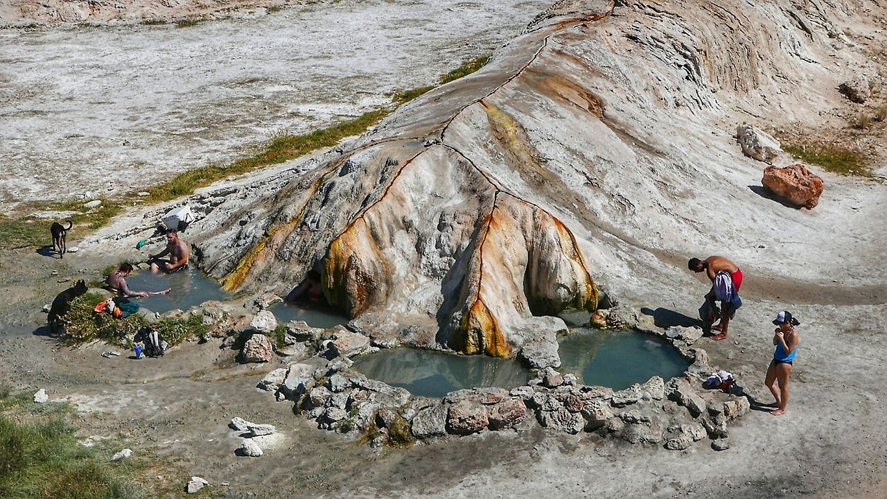 온천은 툭 튀어나온 이마처럼 불룩한 바위 아래 있다. 언덕에서 온천수가 낙하에 석회암 퇴적물인 트래버틴 바위 아래로 모인다. 온천은 바위를 따라 길쭉하게 나 있다. 사람들이 꼭 공원 벤치에 앉아있는 것 같다. 60도 고온 온천수가 폭포수처럼 떨어지는데 아름답다고 만지면, 그 다음은 상상에 맡기겠다.