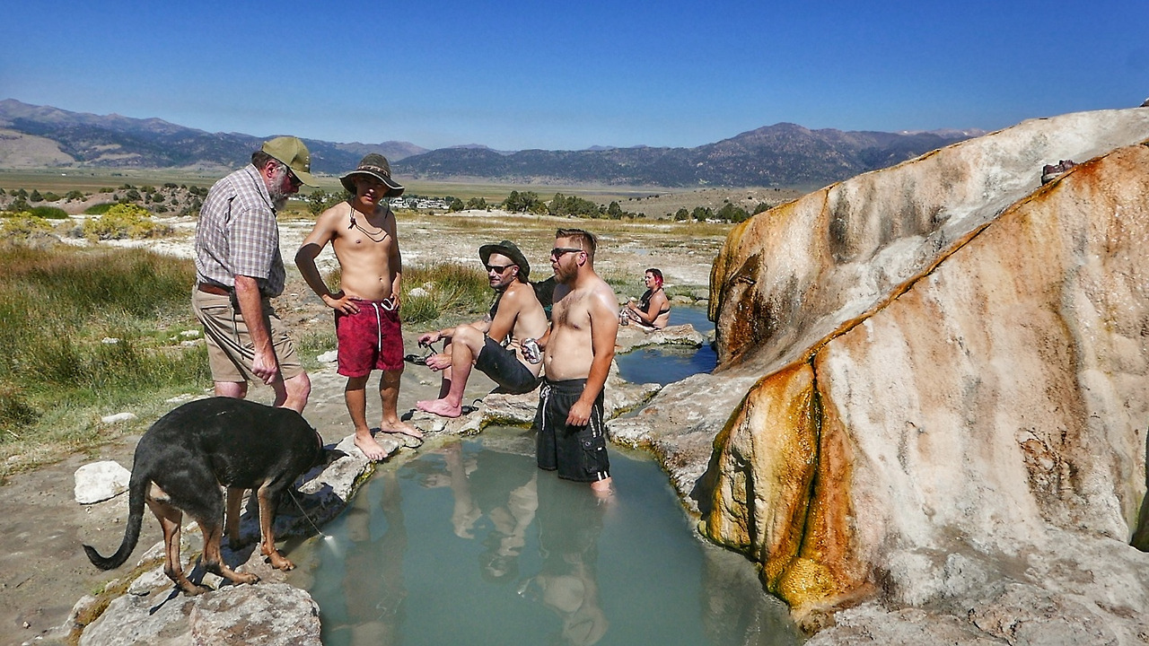 모노레이크에서 북쪽으로 42km, 브리지포트에서 동쪽으로 3.5km 떨어진 곳에 트래버틴 온천(Travertine Hot Springs)이 있다. 이곳도 내비게이션에 장소 이름을 찍으면 쉽게 접근할 수 있다. 우리가 찾아간 날에는 주차장에 차가 대여섯 대가 있었다. 화장실도 있다.