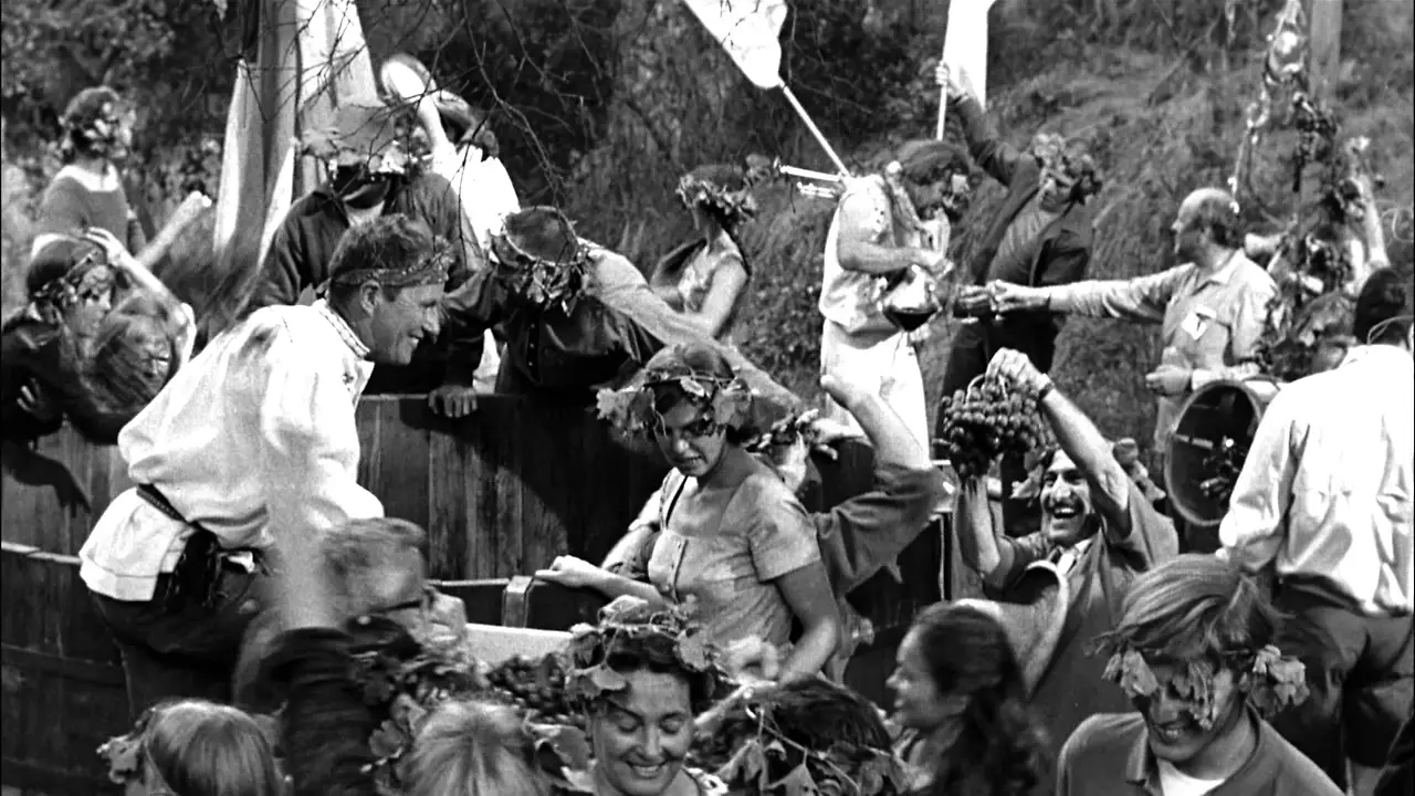 영화 속 남녀 주인공이 만난 사람은 몬테시토 온천 일대에서 활동했던 보헤미안 커뮤니티인 '마운틴 드라이브'다. 영화는 두 인물이 포도밟기 행사(Wine Stomp)에 참여한 모습을 카메라에 담았다. 그 해 선정된 와인 퀸이 홀딱 벗은 상태에서 황금색으로 칠한 포도잎 화관만 쓰고 포도주 통에 들어가 포도를 밟기 시작한다. 이후 남녀 주민이 모두 발가벗고 와인 통에 들어가 포도주를 마시며 얼싸 안고 춤추고 웃고 키스하며 포도를 밟는다. 당시 영화사는 실제 축제 장면을 촬영하는 대가로 커뮤니티에 돈 5000달러를 냈다.