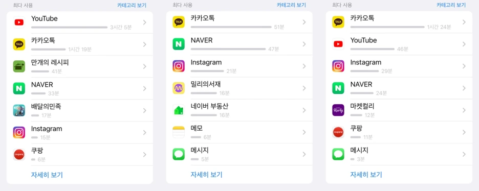 매일 얼마 만큼의 시간을 매신저에 쓸까. 가끔 정신차리고 보면 PC 화면가득 대화창이 몇개씩 열려있는 것을 발견한다. 여기 저기 깜빡거리는 대화창을 오가며 일을 하다 보니 결국 일은 뒷전이고 쏟아지는 텍스트박스에 정신이 산란해진 경험은 누구나 있을 것이다. 이미 2017년에 와이즈앱은 안드로이드 사용자 대상으로 한달 동안 가장 많이 쓰는 모바일 어플리케이션을 조사 했는데 카카오톡이 월 사용시간 403억분으로 1위였다고 발표했다. 나는 얼마나 많은 시간을 여기 쏟고 있을까. 지난 3일간의 어플리케이션 사용량을 살펴보았다. 보통 업무시간동안은 PC카카오톡을 켜놓고 스마트폰을 들여다보지 않기 때문에 휴대폰 어플사용량이 PC에서 사용한 시간까지 집계하는지는 잘 모르겠다. 하지만 이미 상당히(!) 긴 시간을 단지 카카오톡 매신저에 쏟고 있지 않은가. 이 글의 서두에 시간이 없다고 변명한 내가 갑자기 부끄럽다. 월요일에는 무슨이유에선지 무려 3시간이나 유튜브를 시청했다! (무엇을 그렇게 골몰히 봤는지 기억조차 나지 않는다.)