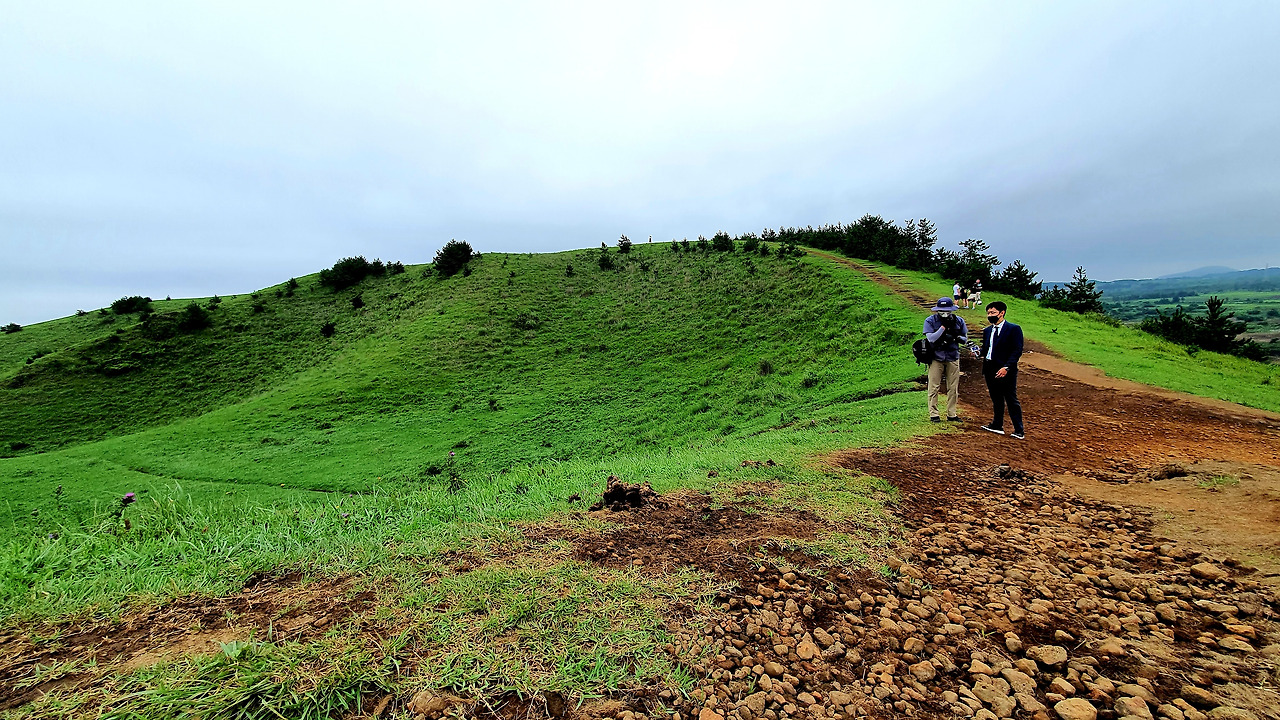 놀러 온 사람들을 탓할 수는 없겠지만, 코로나19로 강제휴식기(?)를 취하던 제주가 혹시 다시 훼손되고 있지는 않은지 궁금했습니다. 제주 시민단체에 문의해봤더니 저희를 용눈이오름으로 데려가 주시더군요. <효리네 민박>에 나오면서 최근 들어 급격히 유명세를 탄 오름이었습니다. 비가 부슬부슬 내리는 날이었지만 입구 주차장은 꽉 차 있었습니다.