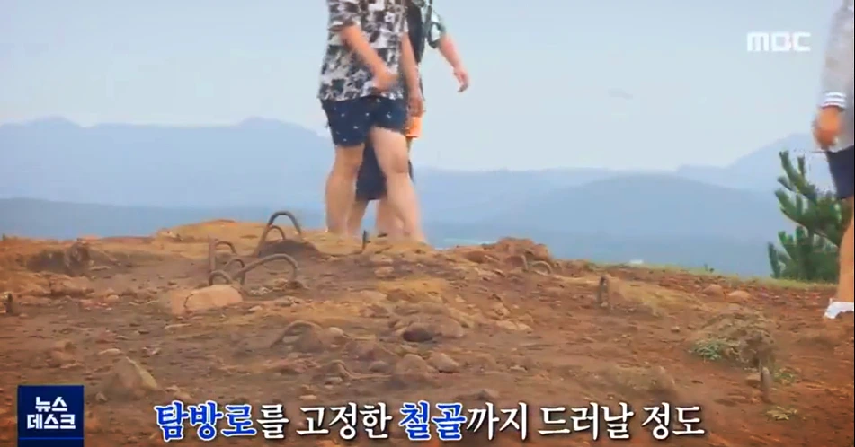 탐방로를 올랐는데, 비전문가인 제 눈에도 황폐해진 모습이 확연히 보였습니다. 탐방매트를 고정하는 철골은 1년 전만 해도 흙속 5cm 아래에 묻혀 있었다는데, 지금은 땅 위로 5cm 이상 돌출돼 있더군요. 그러니까 지난 1년 새 오름이 10cm나 깎여나간 셈입니다. 코로나19로 몇 달간 출입이 통제됐다는 걸 감안하면 불과 몇 달 사이에 벌어진 일이죠. 동행했던 제주 참여환경연대의 홍영철 대표님은"화산지형의 특성상 오름의 흙은 한 번 파여서 쓸려내려가면 영원히 복구할 수 없다"고 경고했습니다. 인기 TV 프로그램 출연으로 용눈이 오름은 '대박' 떴지만, 동시에 서서히 닳고 있던 겁니다.