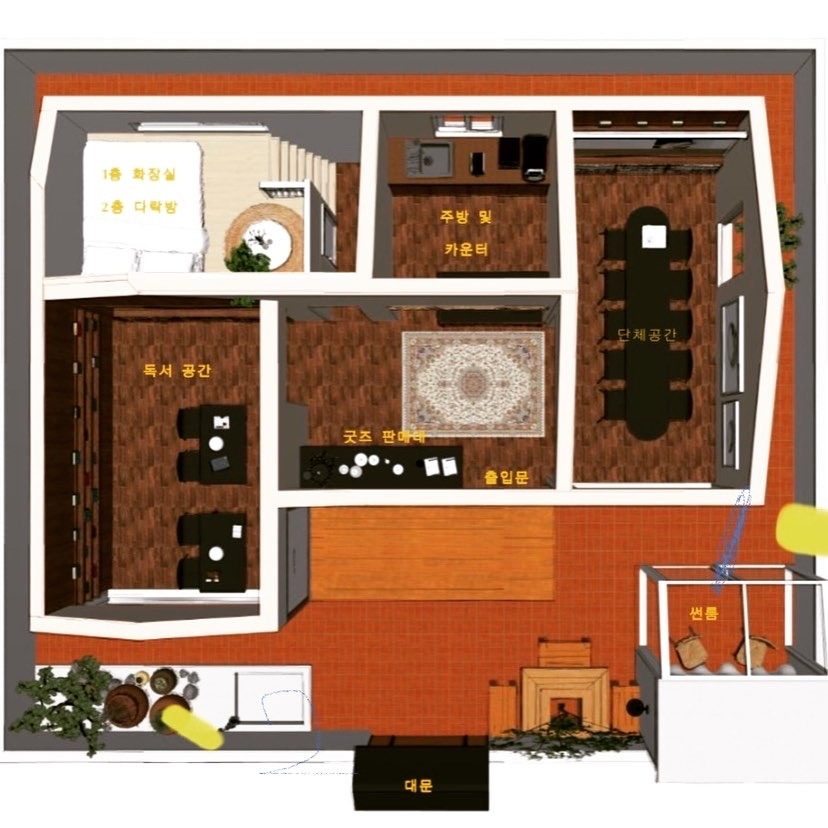 마지막으로 화려한 겉모습보다는 단명한 지향점이 드러나는 공간으로 꾸미고 싶었습니다. 그 지향점은 나뭇결, 노란 불빛, 그리고 책으로 시각화할 것이었습니다. 모두 마음을 잔잔하게 하는 일상의 원소들이지요. 그래서 처음 왔을 땐 '와!'하고 감탄하지 않더라도, 오래 머무를수록 안정감과 온기를 느끼는 공간으로 거듭나길 바랐습니다.