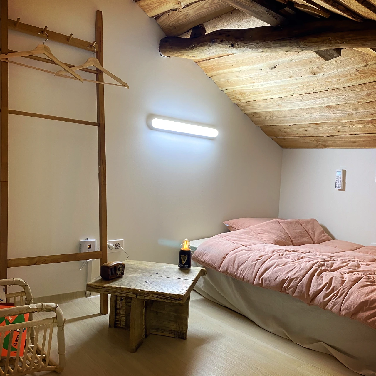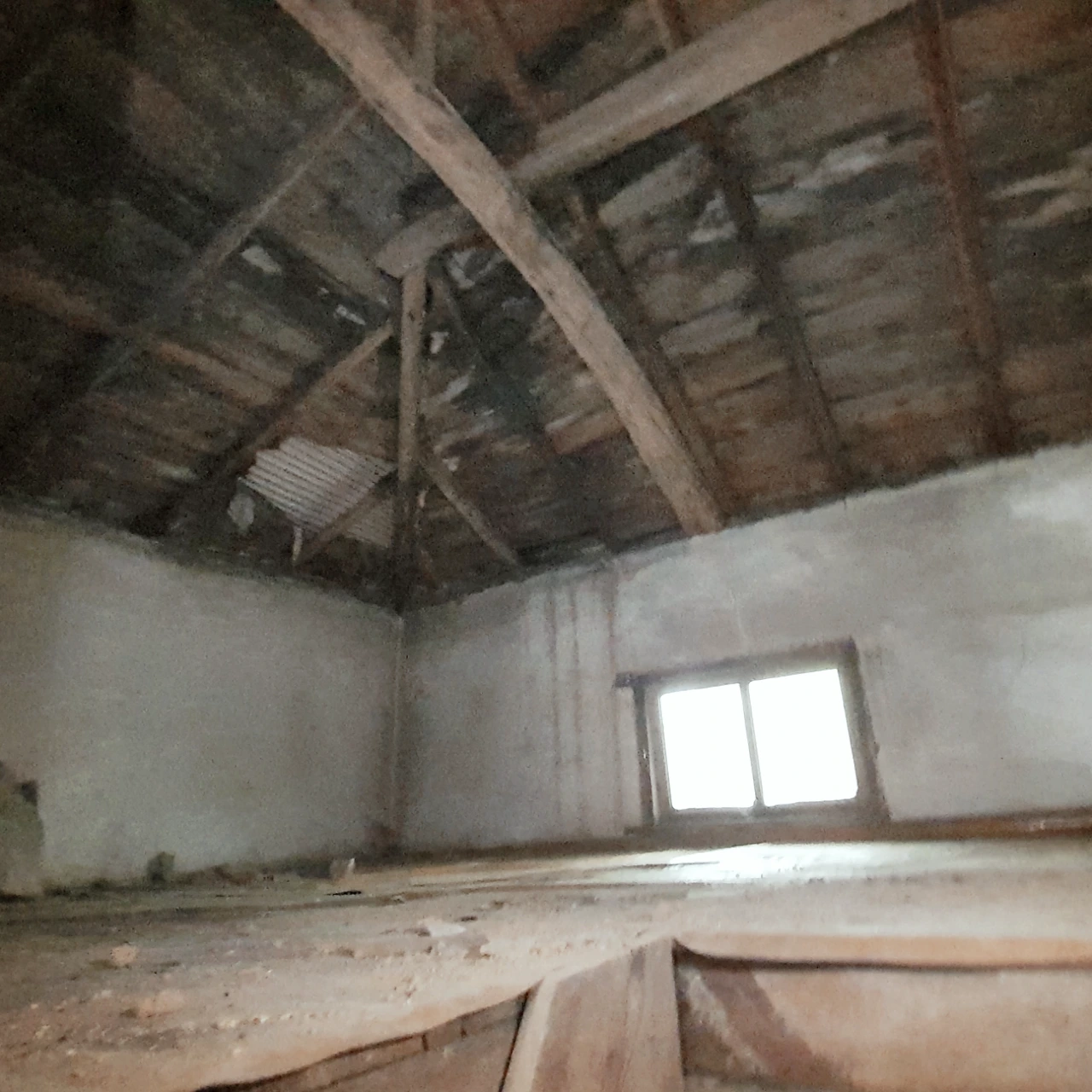 일단 다락의 바닥과 지붕을 안전하게 정비하고, 디자인은 다른 공간과 달리 밝은 톤으로 꾸미기로 했습니다. 혼자 주무실 분들이 '무섭다'는 생각이 들지 않았으면 해서요. 거기에 돌담이 얼핏 보이도록 키작은 창문을 길쭉하게 넓히고, 자그마한 수제 고목탁자를 제작 주문하기로 했어요. 일어서면 천장에 머리를 찧을 법한 키낮은 공간이니 그냥 눕거나 앉아서 책 읽으시라고요. 나무 천장은 니스칠을 하지 않은 채 나뭇결 그대로 숨을 쉬도록 내버려 두기로 했습니다.