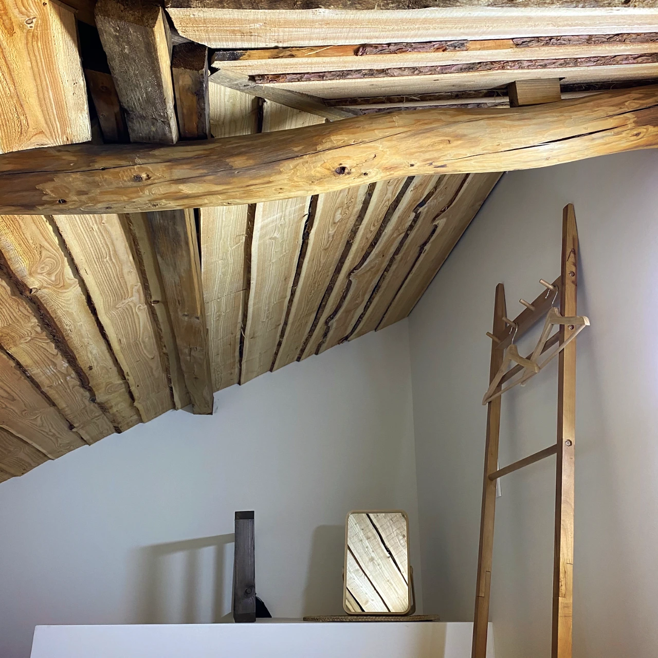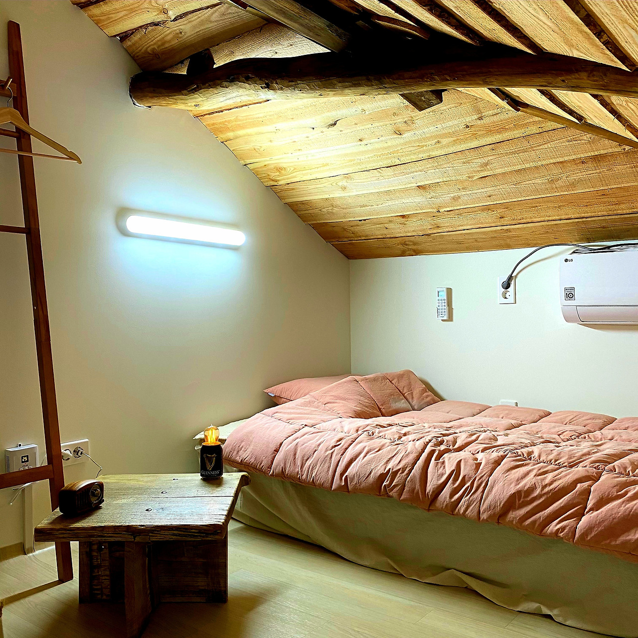 첫서재에는 두 평 남짓한 자그마한 다락방이 있습니다. 부서져가는 지붕 아래 나무를 덧대고, 대들보를 다듬고, 돌담이 보이도록 키작은 창문을 낸 방입니다. 그 방 안에 느릅나무를 깎아 지름이 두 뼘 남짓한 고목탁자를 만들고, 맥주 캔을 재활용한 전구와 원목 스피커를 올려두었습니다. 몇 권의 책을 누일 나무바구니도 놓아두었습니다. 서재의 다락방이니까요. 침대와 침구도 정성스럽게 골랐답니다. 방의 이름은 ‘첫, 다락’이라고 지었어요. 첫서재가 준비한 1인 북스테이 공간입니다.
