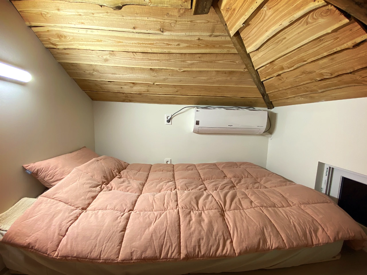 원칙은 그렇습니다. 슈퍼싱글 사이즈 침대가 하나 마련돼 있고, 두 분이 머물기엔 정말 비좁고 답답한 다락방입니다. 다만 꼭 둘이 와야 하는 어쩔 수 없는 사연이 있다면 예약할 때 미리 말씀해주세요. 따로 토퍼나 담요를 준비하겠습니다. 예약 후에 인원을 변경하는 건 불가합니다.