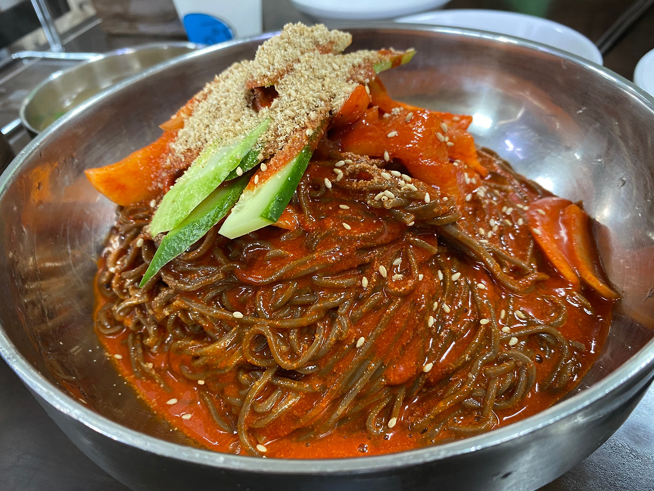 면식기행(麵食紀行), 그 두 번째로 꼽을 만한 동네 국숫집이다. 합정동 끝자락과 망원동 초입 사이에 있는 이 가게는 서울 살 적 우리 집과 회사 가운데 있어서 비교적 더 자주 들르기도 했다. 내가 가장 자주 주문한 메뉴는 '메비곱'이다. 메밀 비빔국수를 곱빼기로 시키면 차림사 님이 주방에 크게 '메비곱 하나!'를 외치는데 그 이름을 듣는 순간부터 입에 군침이 돈다. 보통 비빔국수가 각종 채소와 버무려 나오는데 비해 이곳의 비빔국수는 국수와 비빔양념, 오이, 무생채로만 구성되어 있다. 나는 오이를 싫어하는 만큼 구성이 한결 더 단출해진다(사장님, 오이 빼주세요!). 다른 비빔국수가 맵고 청량하고 가벼운 맛인 데 비해 이곳의 양념은 꽤나 무겁고 되직하다. 이 되직함을 한입 베어 물면 신기하게도 향긋한 기운이 입 안에 퍼진다. 이런 신비한 비빔국수보다 더 인기 있는 메뉴는 잔치국수다. 4,500원에 이 정도 감칠맛 나는 국물을 배불리 먹는 기쁨이라니. 값싸고 흔한 메뉴지만 아직 내 입맛에는 이와 비견할 만한 곳을 찾지 못했다.