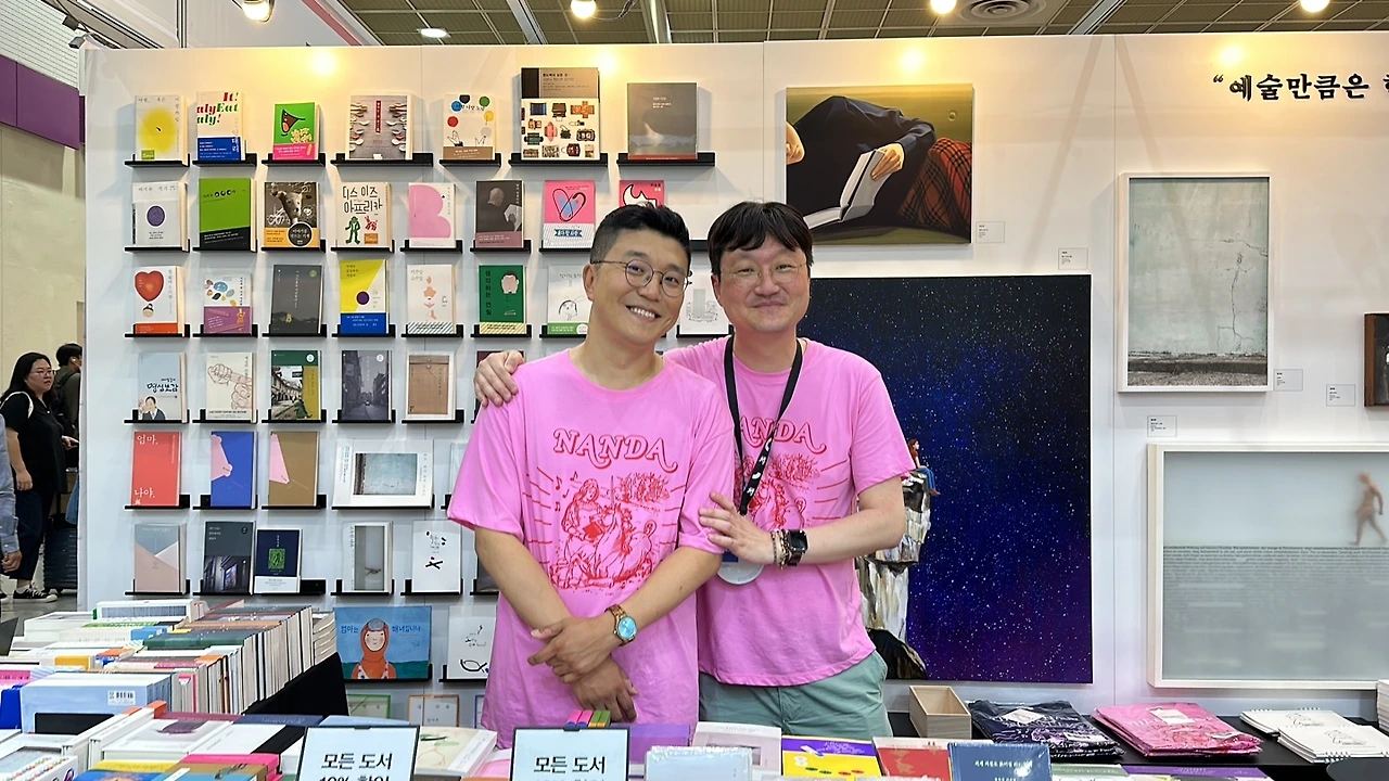 그의 강연 몇 시간 전 도착해 전시장에 들어섰다. 입구에서 머지않은 곳에 나의 두 번째 책 <돈이 아닌 것들을 버는 가게>를 내준 난다 출판사의 부스가 보였다. 미리 준비한 꽃다발을 들고 찾아가 인사드렸는데 엉겁결에 유니폼까지 맞춰 입고 책 파는 알바(?)로 동원되었다. 니 책은 니가 팔고 가라는 거역할 수 없는 정언명령이었다. 한참을 멀뚱멀뚱 서 있었는데 그 모습을 가엾이 여긴 친구 오은 시인이 대신 열심히 책팔이 노릇을 해줘서 3권이나 팔아줬다.