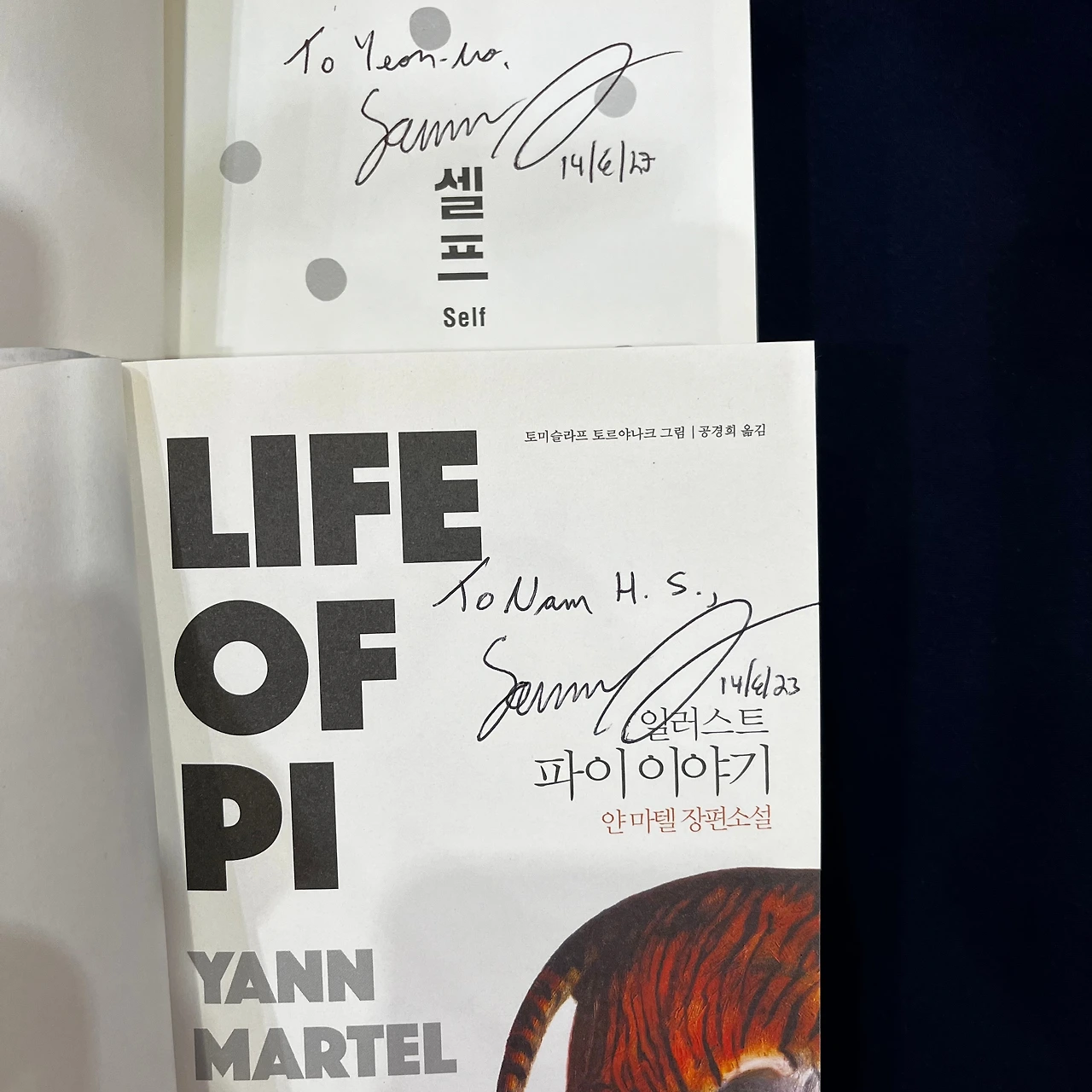 강연 끝나고 미리 가져온 그의 저서 두 권에 사인을 받았다. 집에 오래 묵혀두어 누레진 책들이 다시 살아났다. 10년 전 처음 알고 동경하게 된 작가와의 기승전결에 마침내 마침표를 찍은 기분. 하나는 내 이름, 다른 하나는 연호 이름으로 사인을 받았다. 얀 마텔이 묻더라. 아들이 몇 살이냐고. 만 9살인데 몇 년 있다 건네줄 거예요, 라고 얼떨결에 대답했는데 진심이었다. 중학생이 되면 읽어보라고 슬쩍 내던져 줄 셈이다. 아마 안 읽겠지만.