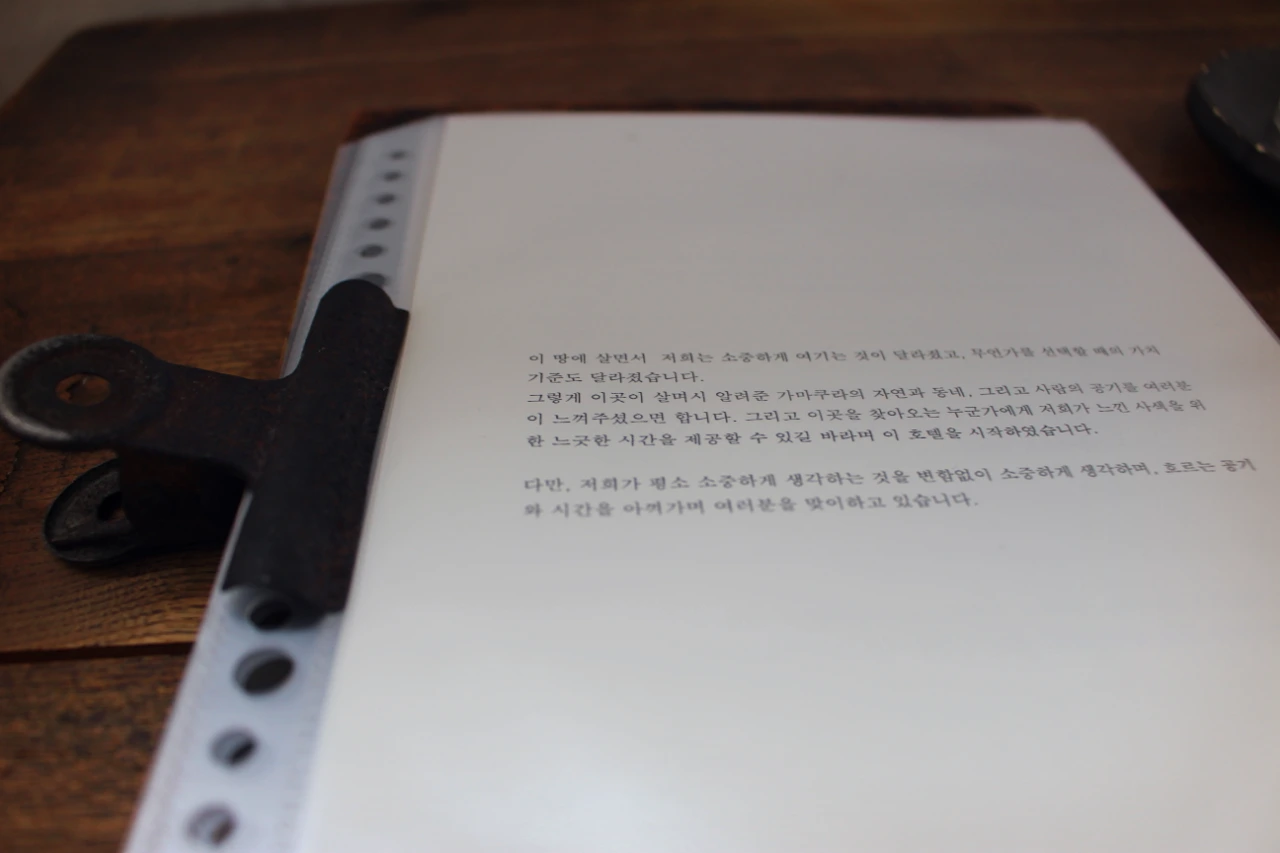 일회용품과 플라스틱 대신 나뭇결과 놋쇠의 품에서 쉬어가라 한다. 음식부터 가구까지, 대량 생산한 그 어떤 것도 들이지 않았다 한다. 친구가 세공해준 놋그릇에 잔돈을 내어주고 앞바다에서 잡은 생선으로 아침을 내어준다.