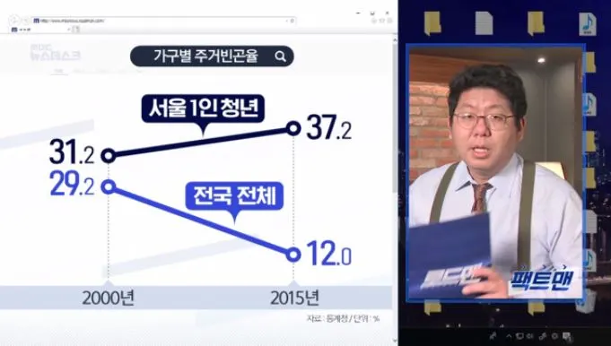 그런데 청년들만 따져 보니 오히려 그 비율이 더 늘었습니다. 서울에 사는 20~34세를 분리해서 통계를 보면, 같은 기간 31.2%에서 37.2%로 올랐습니다. 청년 세 명 중 한 명은 주거빈곤자인 셈이지요.