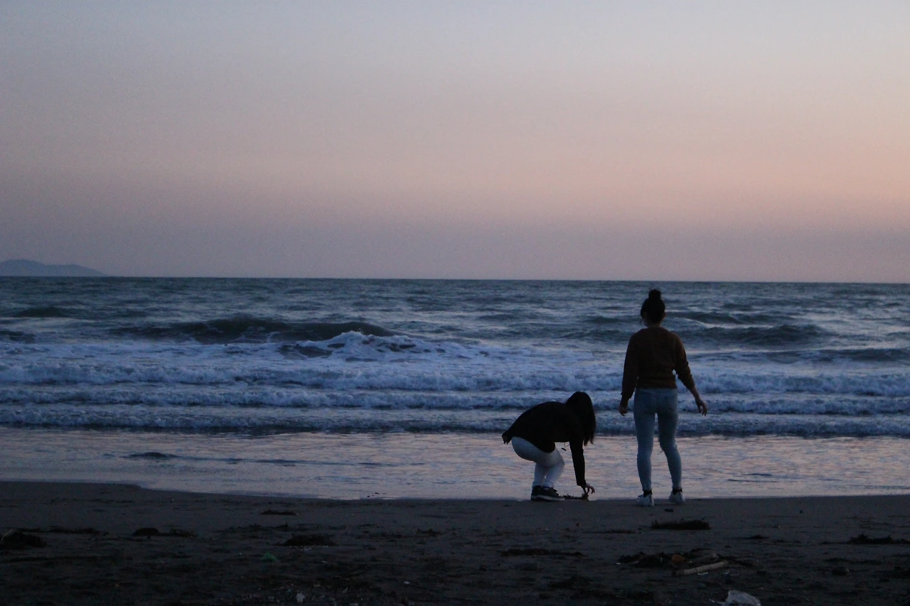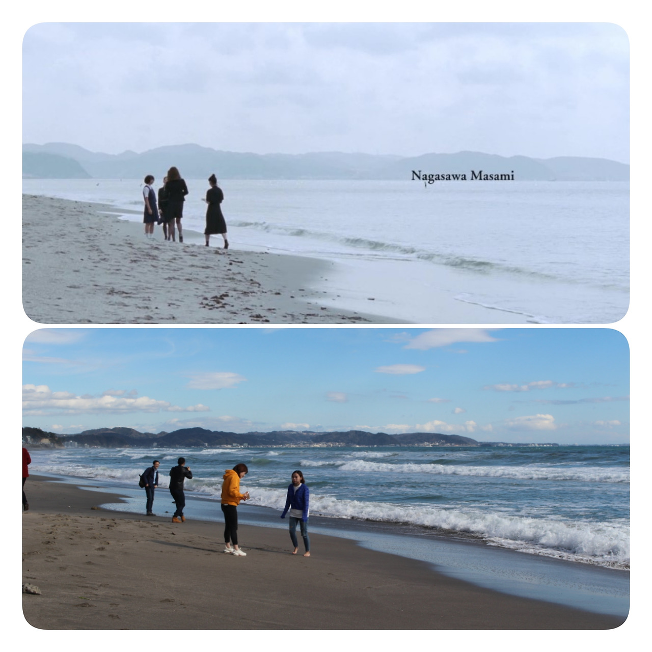 영화의 엔딩 컷(위)과 실제 찍은 해변.엔딩 장면 역시 네 자매가 해변을 걸으며 마무리된다. 바로 이 해변에서.
