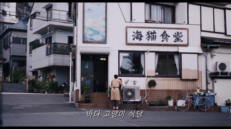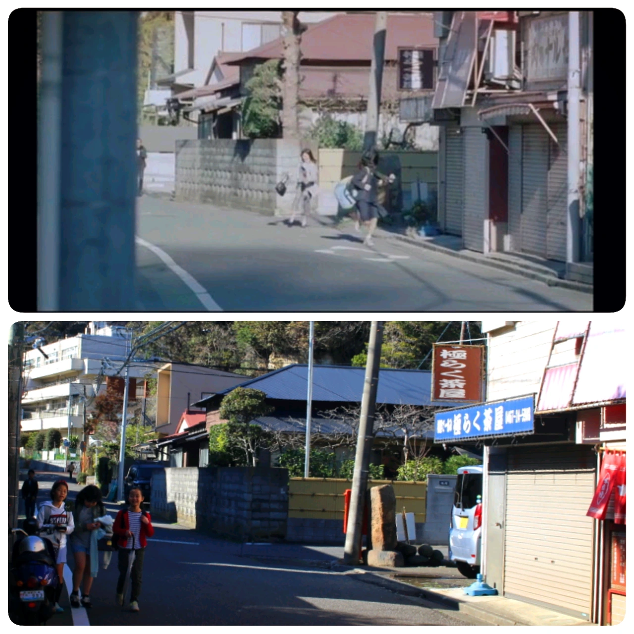 영화 속 스즈는 항상 뛰고 있구나(위). 주변 건물 모양과 간판을 보면 아래 사진 파란색 지붕 집을 세트장으로 개조했던 것 같다.