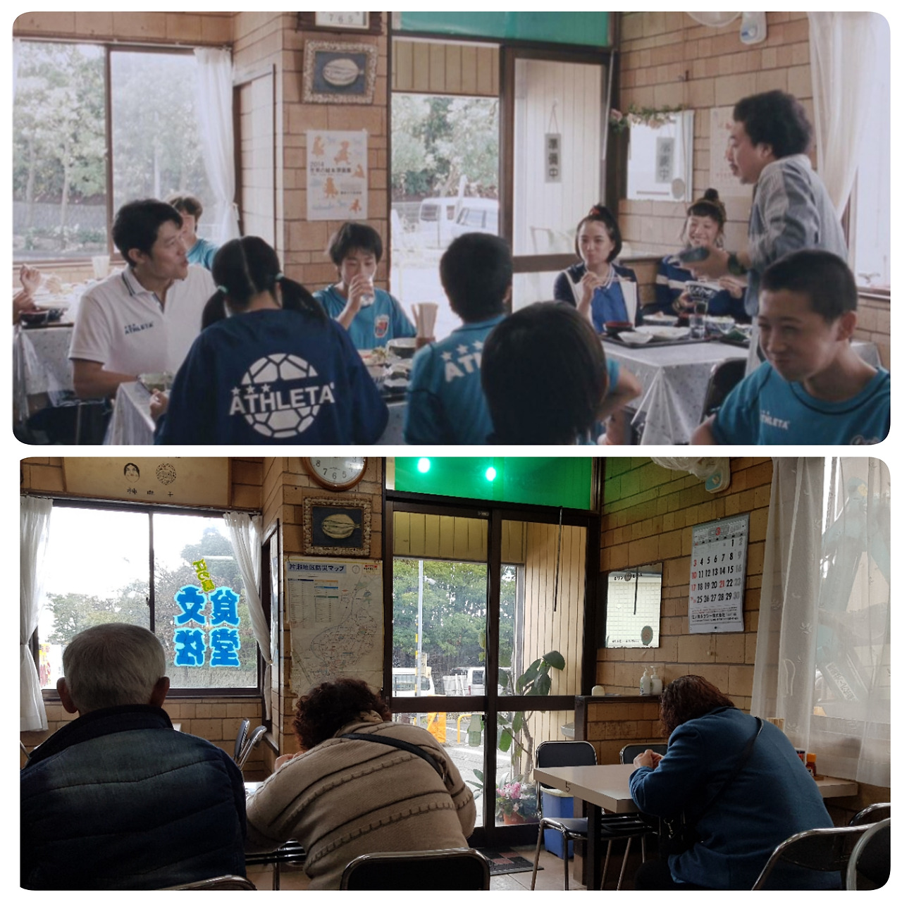 영화에서 축구부 단체 회식 장면(위). 내가 갔을 땐 소년들 대신 동네 어르신들이 식사 중이셨다(아래).영화와 달리 문좌식당에서는 생멸치회덮밥을 팔지는 않는다. 익힌 멸치덮밥과 각종 덮밥류를 파는데, 맛은 영화만큼 각인될 정도는 아니었다. (다음날 들렀던 바로 옆집이 더 맛있던데.) 결코 맛없다는 얘기는 아니다. 영화 속에 앉아있다는 감흥에 취해 맛이 잘 기억나지 않았다고 하는 편이 사실에 가깝겠다.