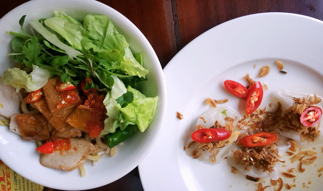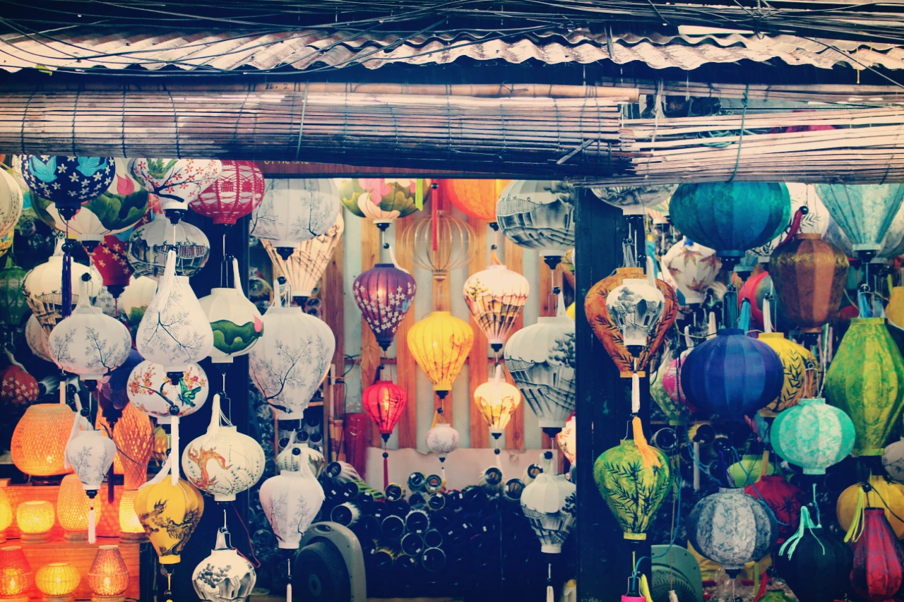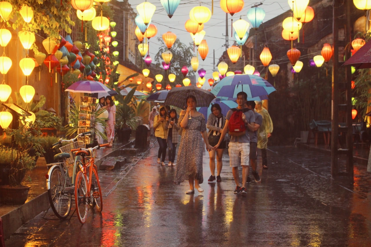 네 다리가 욱신거릴 즈음엔 미리 검색해둔 현지식당에 들러 끼니를 때웠다. 영선은 동네 명물이라는 화이트로즈(쌀반죽에 새우와 야채를 넣고 찐 음식)를 주문했고, 나는 베트남식 비빔국수인 카오 라우를 시켰다. 둘이 합해 5천 원 남짓. 값도 맛도 담담해서 좋았다. 설사 맛이 없었다 해도 잘 먹긴 했을 터였다. 우리는 원래 음식 불평을 거의 하지 않는 외식 파트너다. 배를 채우고 비가 좀 그치길 기다리니 어느새 해가 설핏해졌다. 스며든 어둠 사이로 풍등이 하나둘 불을 밝혔다. 고요히 흐르는 운하와 그 위에 그림처럼 떠있는 조각배들이 빗물을 머금고 반짝이기 시작했다. 우리는 다시 강 건너 야시장으로 발걸음을 옮겼다.