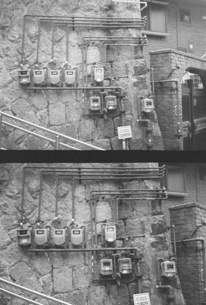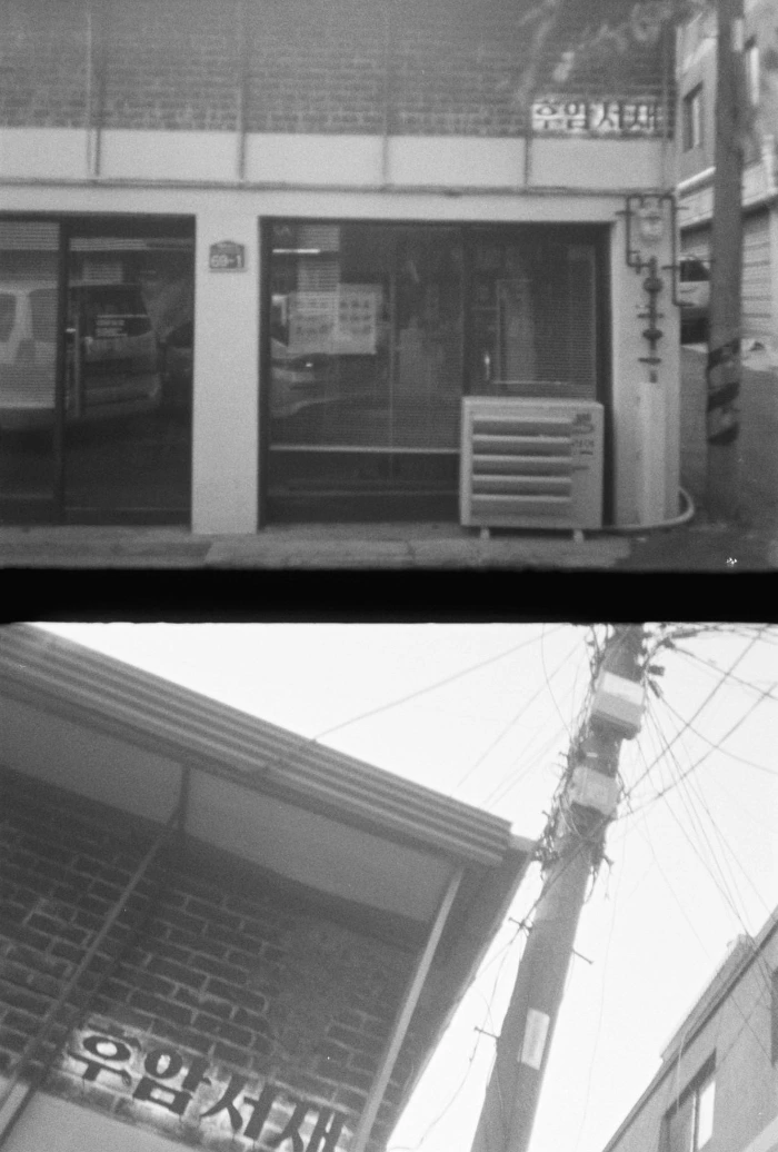 하프카메라(필름 1장은 반으로 나눠 쓰는 카메라)라서 이렇게 두 장씩 나란히 인화가 된다. 한 장 짜리 사진은 인화된 뒤에 인위적으로 자른 것.