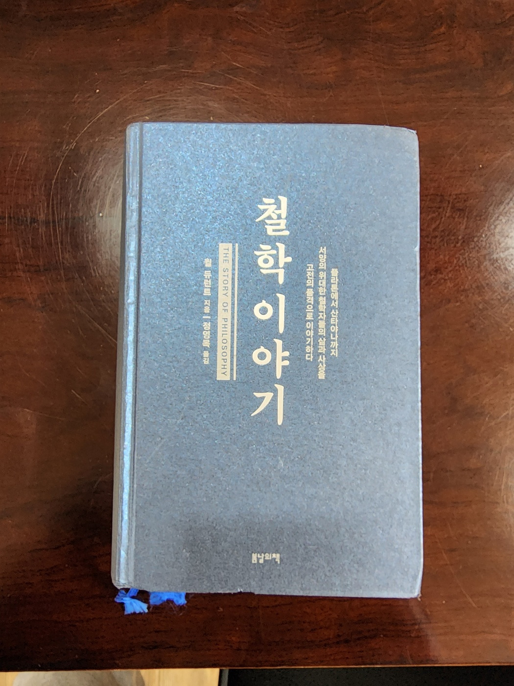 내가 읽은 번역본은 황문수님이 번역하고 고려대학교 출판부가 1975년에 출판한 책이었다. 이사 다닐 때마다 책을 버렸고 어느 날은 큰 결심을 하여 남아 있는 모든 책을 버렸다. 철학이야기는 도저히 버릴 수 없어서 사무실에 갖다 놓았다. 몇십년이 지났으므로 책은 누더기처럼 낡은 상태가 되었다.