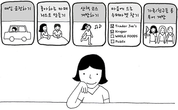 내 첫 주문은 운전을 위한 것이다. 한국에서 몇 년에 한 번 운전을 하다 미국에 와서 다시 운전을 시작하며 두려움이 상당했다. 한국의 고속도로에서는 볼 수 없는 거대하고 긴 트럭들 옆을 달릴 땐 아무리 정신을 차려도 긴 트럭 안으로 빨려 들어가는 느낌이 들었다. 미리 알려주지 않고 양쪽 차선에서 갑자기 끼어드는 남부의 거친 운전자들과 한 번에 3~4개 차선을 연이어 가로질러 길을 가야 하는 도로 구조도 겁이 났다. 자신이 없다는 이유로 운전을 주저하고 무서워하다 어느 날 남편을 보며 생각했다. ‘이 친구가 운전을 하는 것은 자신이 있어서가 아니라 필요해서구나..!’ 내가 운전을 하는 데 자신감은 충분조건이 아니라는 단순한 사실을 그제야 깨달았다.