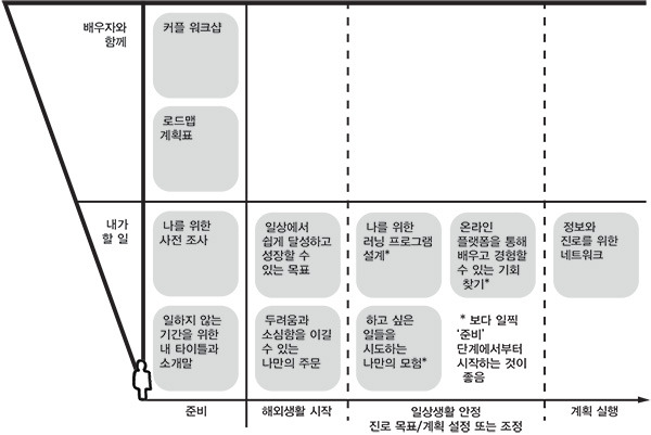 제안했던 아이디어들을 사람들이 해외생활을 준비하며 공통적으로 겪는 단계인 ‘준비’, ‘해외생활 시작’, ‘일상생활 안정 및 진로 목표∙계획 설정 또는 조정’, ‘계획 실행’에 따라 배치하면 위의 그림과 같다. 내가 혼자 해야 할 일들이 있고, 배우자와 함께 팀으로 해야만 하는 일들이 있다. 또, 그 단계에 이르러서 혹은 여유를 갖고 나중에 생각해도 좋을 일들이 있지만, 내 앞에 예정된 미지의 세계를 파악하고 주어진 시간을 어떻게 활용할지에 대해 고민하는 일은 보다 일찍 시작하고 준비하는 것이 좋다.