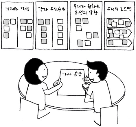 건축에는 설계도가 있고 디자인에는 스케치가 있다. 머리 속의 아이디어를 최선의 공간과 경험으로 만들기 위해 형태와 구조를 만들고 더 나은 모습으로 계속해서 다듬는다. 의논한 계획에 대해 두 사람이 같은 그림을 갖기 위해, 그리고 그 그림 안에 ‘자기만의 방’을 만들고 지키기 위해, 계획을 시각화한 로드맵이 도움이 된다. 내 계획이 명쾌해야 다른 사람들에게도 확실하고 단호하게 얘기하고 이해시킬 수 있다. 모든 계획들을 한자리에 펼쳐 놓고 종류별로 카테고리를 나누고 시간에 따라 순서를 배치해, 나와 우리의 생각을 보여주는 큰 그림을 만들고, 함께 세운 계획 안에서 나를 위한 계획을 구체화할 수 있다. 의사소통을 위해 단계 별로 이름을 붙일 수도 있다. 진학과 취업을 걱정하고 임신을 재촉하는 가족들에게는 부부가 한 팀으로서 함께 정한 계획이 있고 그에 따라 각자 열심히 살고 있음을 알려줘야 한다.