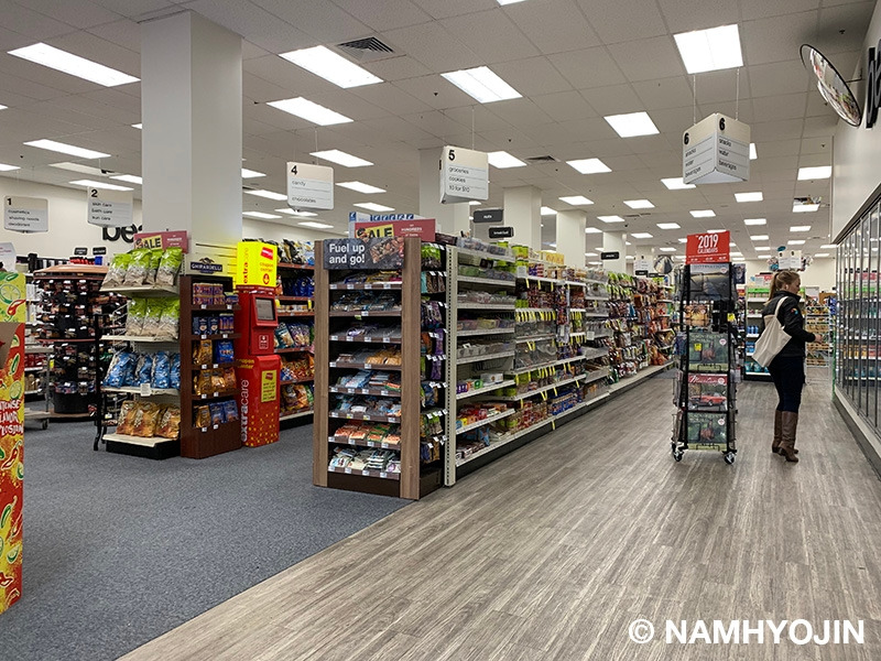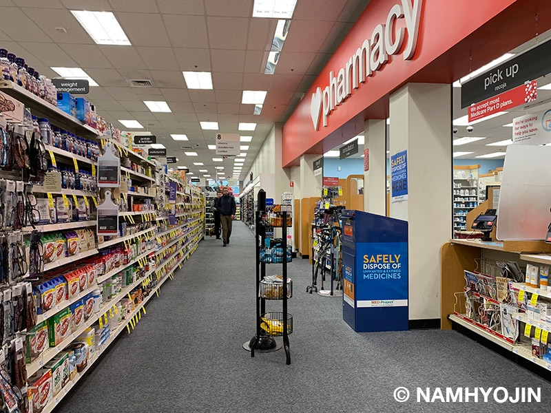 사진. 샌프란시스코 CVS의 내부. 입구에 들어서면 화장품, 세제, 사무용품, 식품, 음료 등의 생필품이 진열되어 있고 그 안쪽으로 의약품들이 진열되어 있다. 가장 안쪽에 약국이 있다.