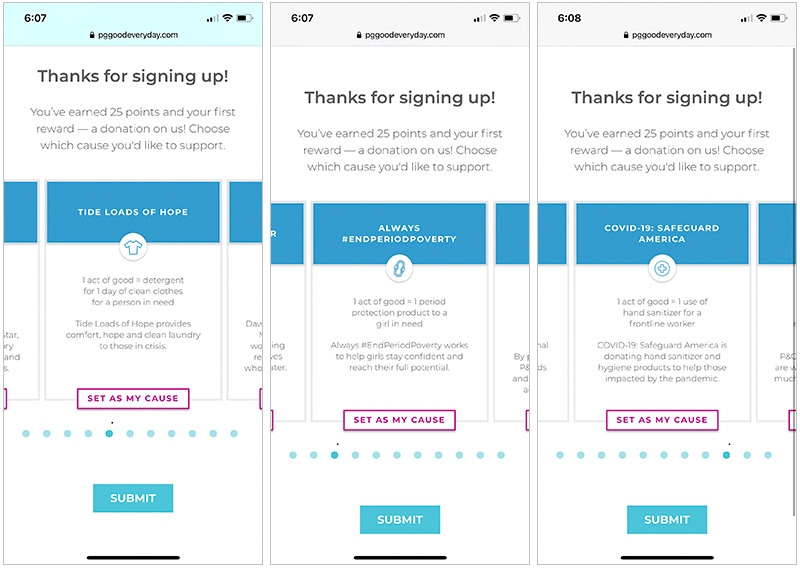 화면. P&G Good Everyday 가입 시 받는 포인트 25점의 기부처 옵션들. TIDE LOADS OF HOPE는 어려움을 겪는 사람들에게 1일분의 세탁 세제를 지원하고, ALWAYS #ENDPERIODPOVERTY는 도움이 필요한 소녀들에게 생리 1사이클 분량의 물품을 지원하며, COVID-19: SAFEGUARD AMERICA는 코로나 유행의 최전선에 있는 근로자들에게 손세정제를 후원한다.