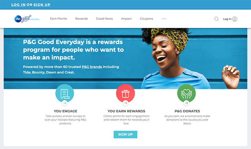 국민 브랜드라는 표현이 어색하지 않은 Tide 세탁세제, Bounty 키친타월, Pampers 기저귀, always 생리대뿐만 아니라 Clearblue 임신테스트기, Oral-B 칫솔∙치약, NyQuil/DayQuil 감기약과 ZzzQuil 수면보조제의 Vicks, Safeguard 비누∙손세정제 등 60개 이상의 브랜드를 가진 P&G는 P&G Good Everyday라는 보상 프로그램을 운영한다. 퀴즈를 풀면 10점, 설문조사에 답하면 25점, P&G 제품을 구입한 영수증을 입력하면 50점, 친구를 가입시키면 최대 5명까지 각 50점을 받아 스타벅스나 도미노 등의 기프트카드로 교환하거나 원하는 곳에 기부할 수 있다.