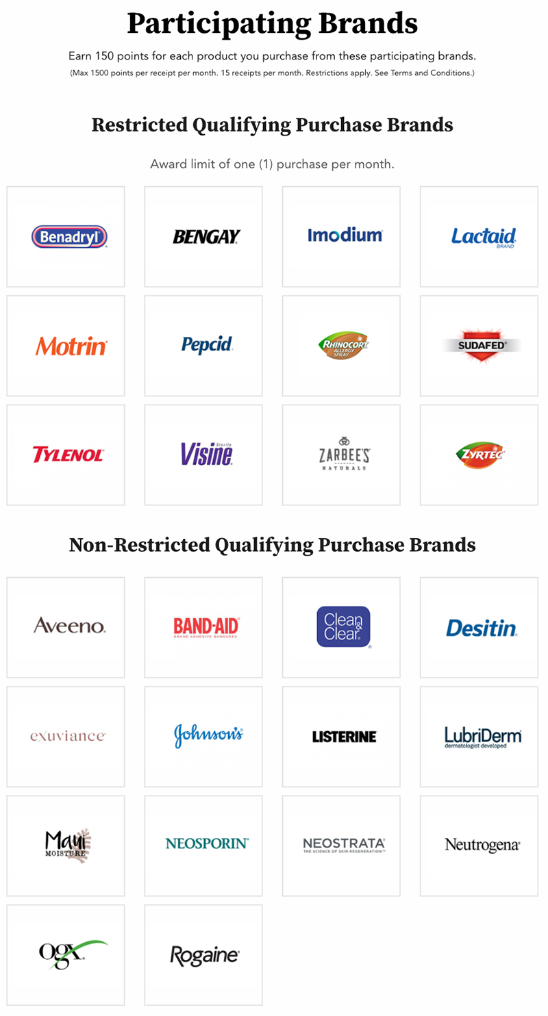 화면. Johnson & Johnson의 보상 프로그램에 Care Club에 참여하는 브랜드들. 대표적인 항히스타민제 알레르기약 베나드릴(Benadryl)과 지르텍(Zyrtec), 지사제 이모디움(Imodium), 이부프로펜(Ibuprofen) 진통제인 모트린(Motrin), 타이레놀(Tylenol), 반창고 BAND-AID, 기저귀 발진 크림 데시틴(Desitin), 한국의 마데카솔이라 할 수 있는 상처연고 네오스포린(Neosporin) 등이 포함되어 있다. (참고. https://mycareclubrewards.com/National/en-us/Products)