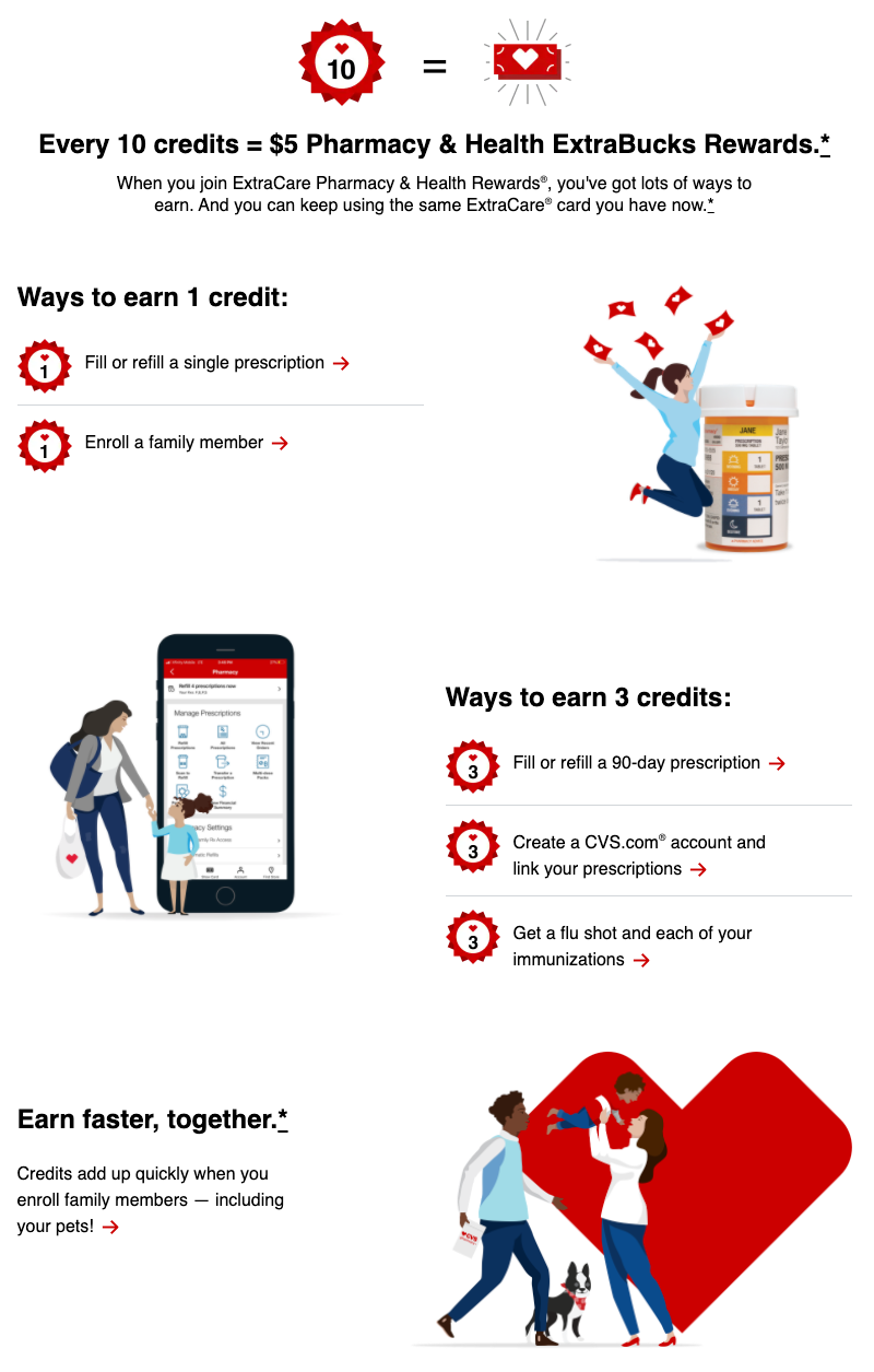 CVS의 무료 멤버십 프로그램인 ExtraCare의 경우, 이용 내역에 따라 다음 CVS 쇼핑에 사용할 수 있는 익스트라벅스(ExtraBucks)라는 크레딧을 제공한다. 30일 처방전으로 처방약을 구입하거나 가족을 회원으로 등록하면 1점, 90일 처방전으로 처방약을 구입하거나 처방전 관리 서비스에 등록하거나 예방접종을 맞으면 3점을 얻을 수 있다. 크레딧 10점은 ExtraBucks $5에 해당하며, 회원 한 명이 일 년에 ExtraBucks $50까지 받을 수 있다. 회원의 구매 습관에 따라 개인화된 쿠폰도 제공한다. (참고. CVS ExtraCare Pharmacy & Health Rewards® Program Rules)