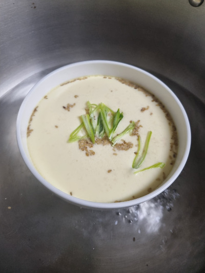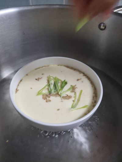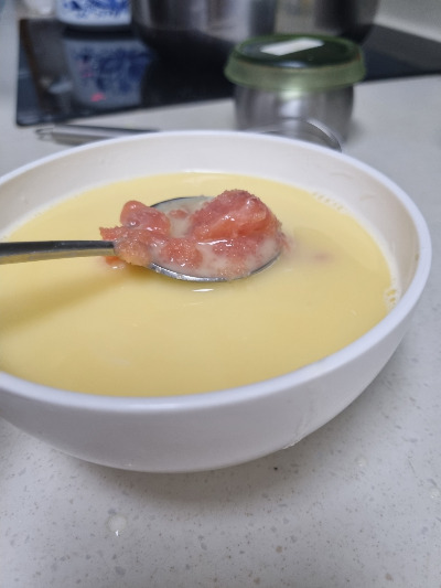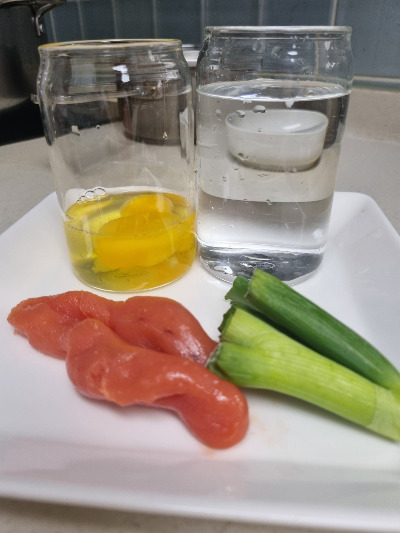 계란 2개, 물 계란에 2.5배인데 400ml 정도 되는 것 같습니다. 명란 두줄 , 파 조금.