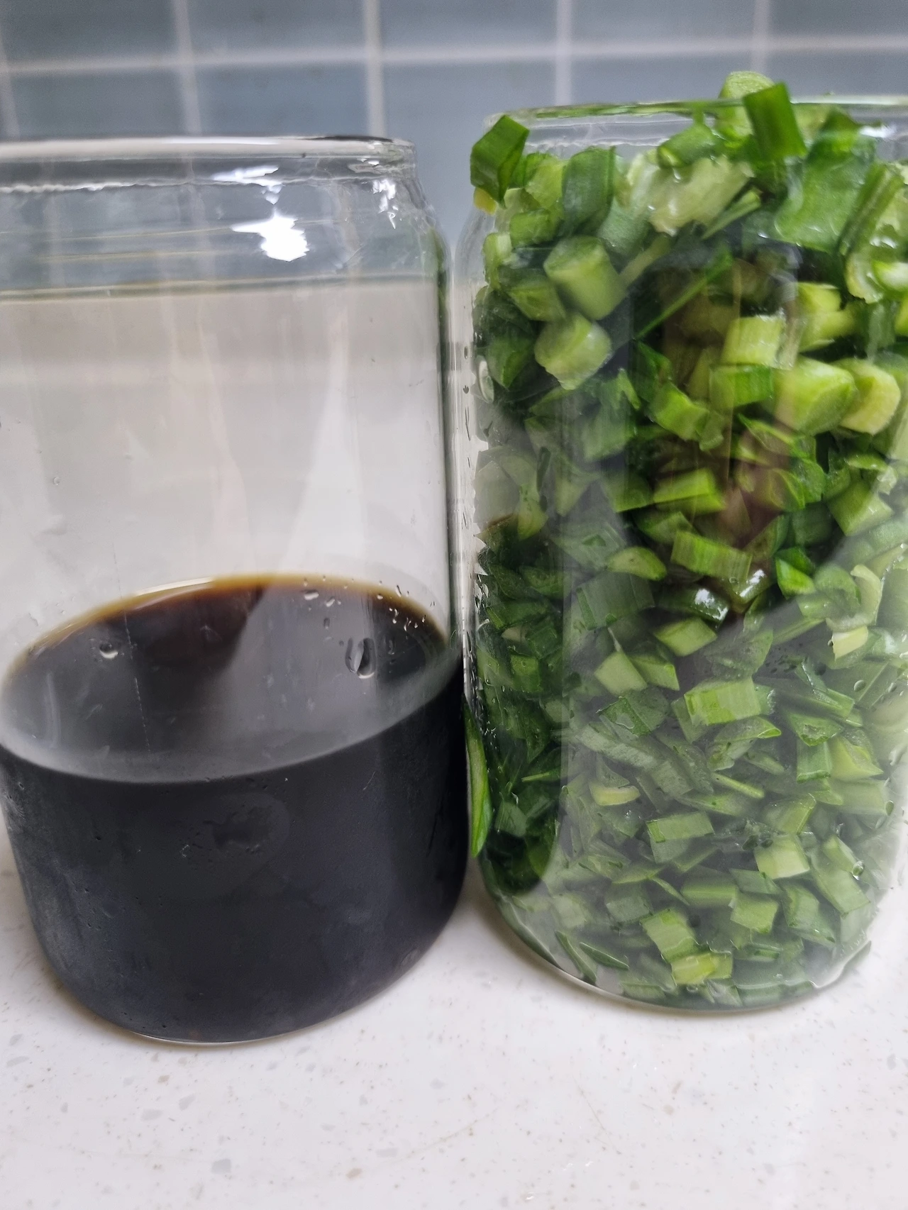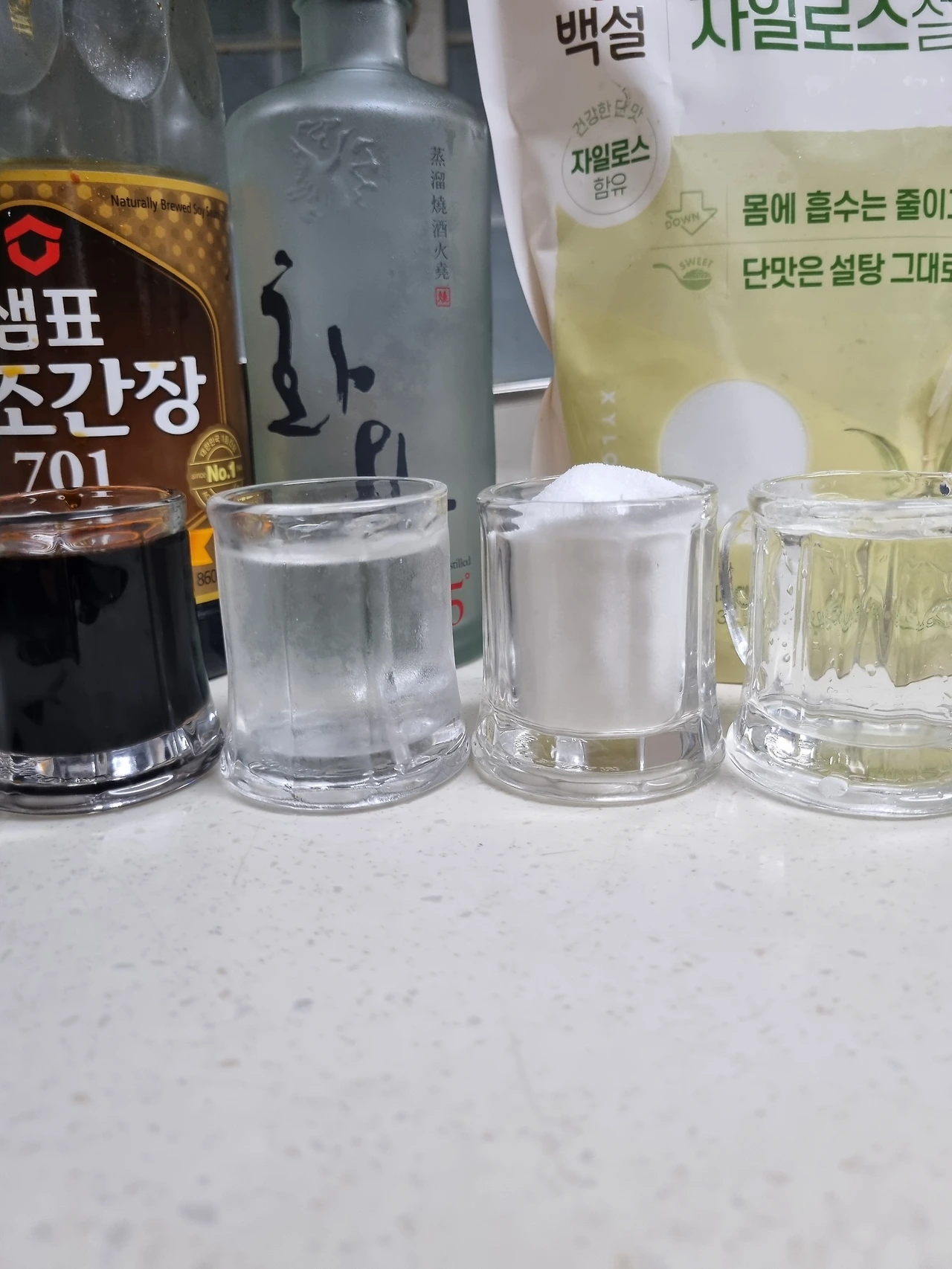 간장 1 소주 1 설탕 1 물 1 부추 한 줌.