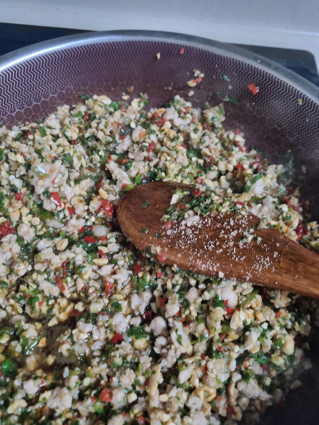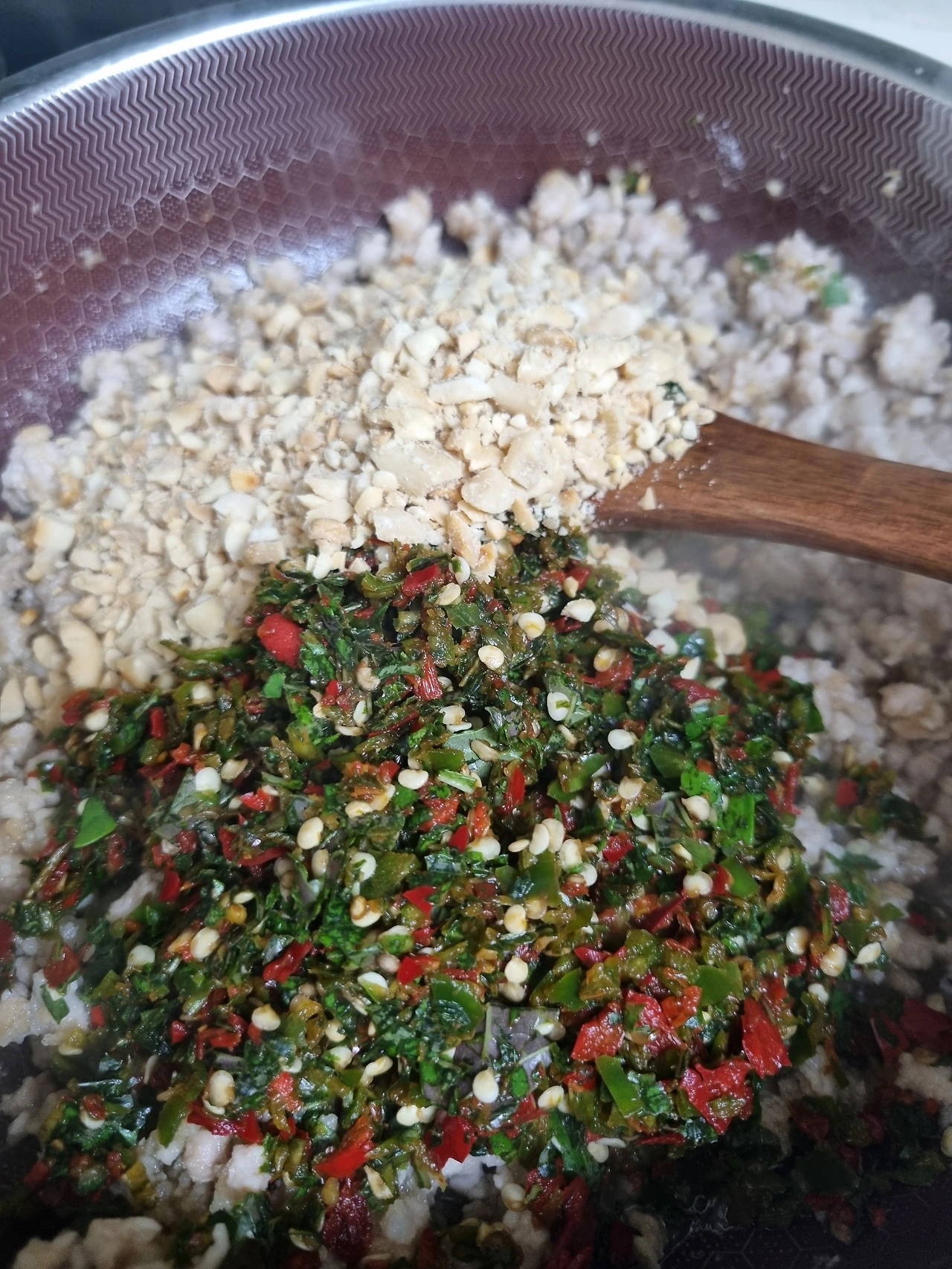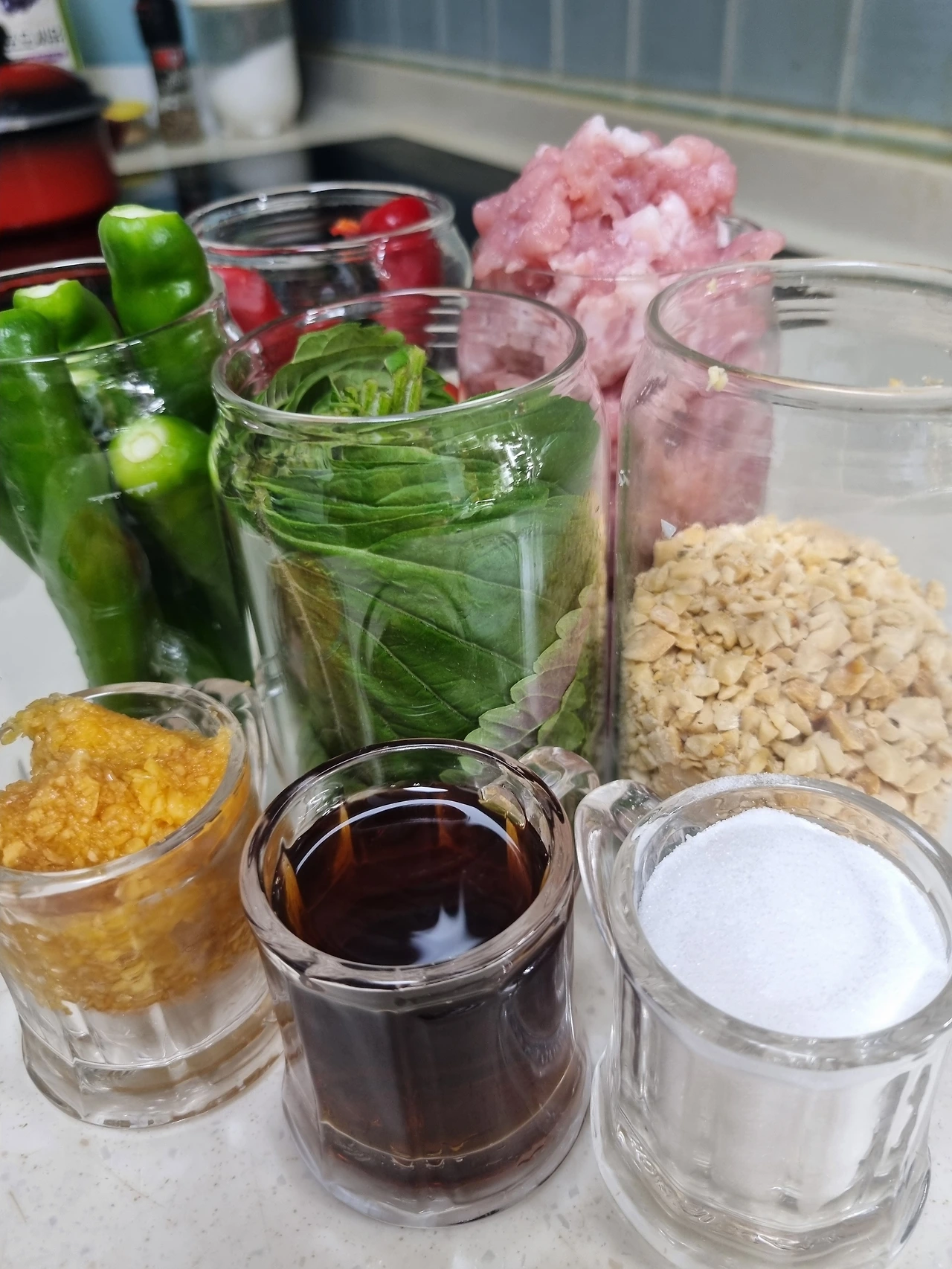 주재료: 다진 돼지고기 300g , 청양고추 7개, 붉은 고추 7개