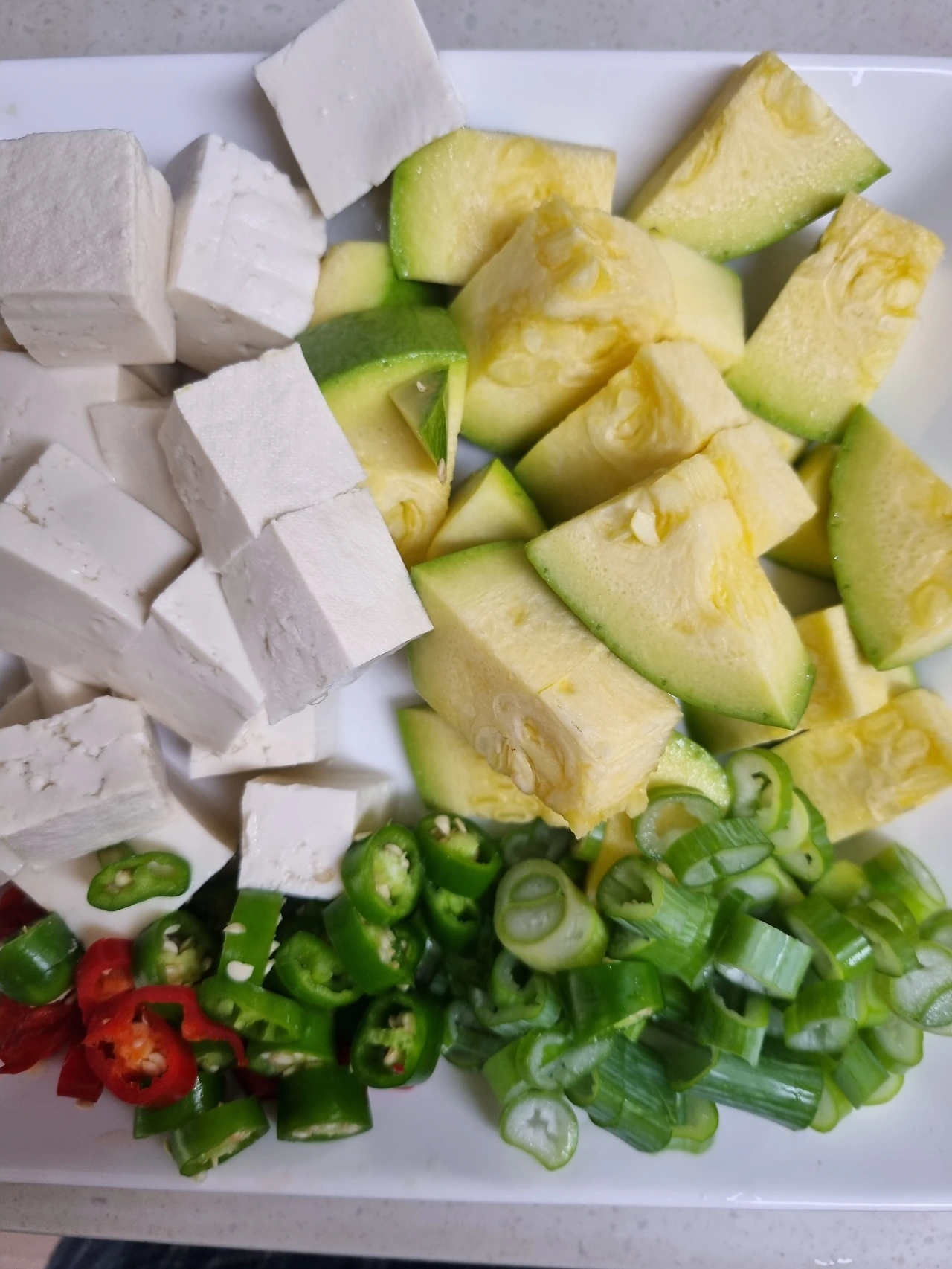 2. 물이 끓을 동안 호박 큼직, 두부 큼직하게 썰어주시고 고추와 파 썰어 준비하세요,