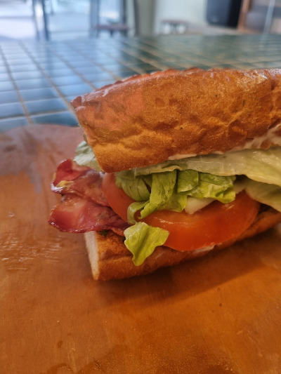 도톰한 호기빵에 마요네즈, 양상추, 베이컨, 토마토 그리고 마요네즈 바른 호기빵.