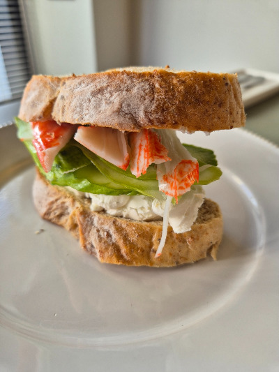 두껍게 크림치즈를 턱턱 바르고 오이 슬라이스를 7장 얹고 맛살을 손으로 찢고 끝이다.