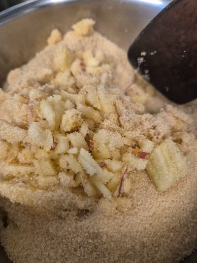 사과 한 알을 잘게 썰고 냄비에 넣고 설탕 두 스푼을 넣고 불을 약하게 올리고 나는 가만히 옆에 앉아서