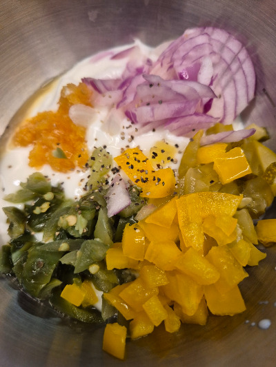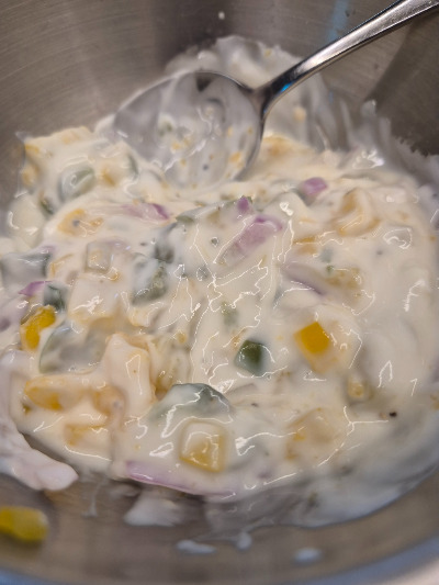 그릭 요구르트에 레몬즙과 양파, 할로 피뇨, 파프리카, 다진 마늘 등의 상큼함을 부여할 수 있는 것들을 넣고 후추룰 넣어서 소스를 만든다.